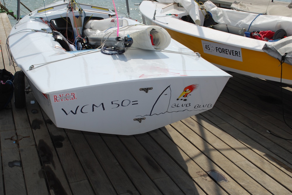 RealClubDeRegatasSantiagoDeLaRiberaThe first day of racing dawned with sunny skies and high winds, 20 knots on the deck at the club. Under postponement we took the opportunity to get the sailors together for a discussion about the class. The biggest concern was the sailors felt there is a lack of communication between the Board of SCIRA and themselves. One of the changes that has been made, that the sailors did not agree with, is the raising of the Masters age to 50. With the Belgians leading the charge, through t-shirts, bumper stickers and an inflatable doll the message was loud and clear that they felt if something is working then don’t change it. With 53 % of the sailors in the Apprentice Master category and 77 participants from 14 countries this regatta is working. To follow up with this concern, as a Board member, I have written to all Board members and expressed the sailors’ disagreement with this change and respectfully suggest they revisit the decision. Lots of other items and ideas were discussed, a summary has been forwarded to the Board, it was very productive.