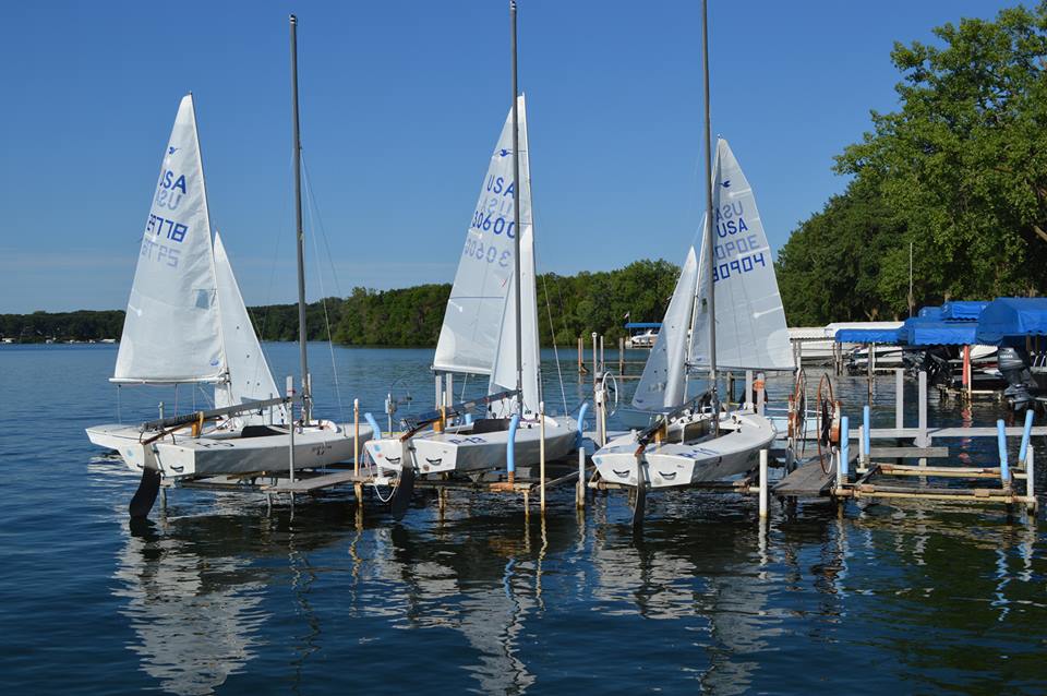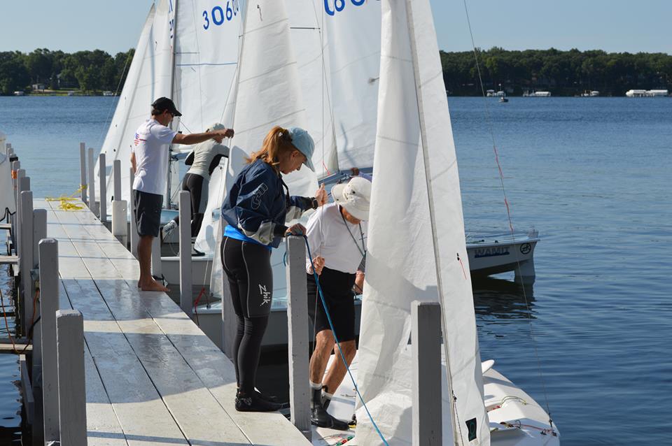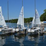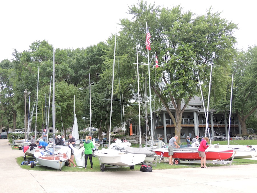 [caption id="attachment_10158" align="alignnone" width=""]Even on the windiest day of the regatta, leaving sails up during the lunch break was, unfortunately, not a problem.[/caption]By Carol Cronin When we drove into Okoboji, IA, home of this year’s US Nationals, I didn’t know much about the state or the lake for which the town is named. And since we didn’t know the state motto, we made one up: “It’s full of surprises.” It seemed to fit, both on shore and on the race course. One surprising fact about Lake Okoboji is that it is one of only three “blue” lakes in the entire world—and the other two are in Switzerland. Since it’s spring-fed, the water is crystal clear and clean enough to drink. At the bottom left of the race course where a point jutted out into the lake (a point that also happened to be the campground home of Team San Diego), I actually thought we were going to run aground a few times since the rocks looked so close to the surface—even though the water was actually quite deep.