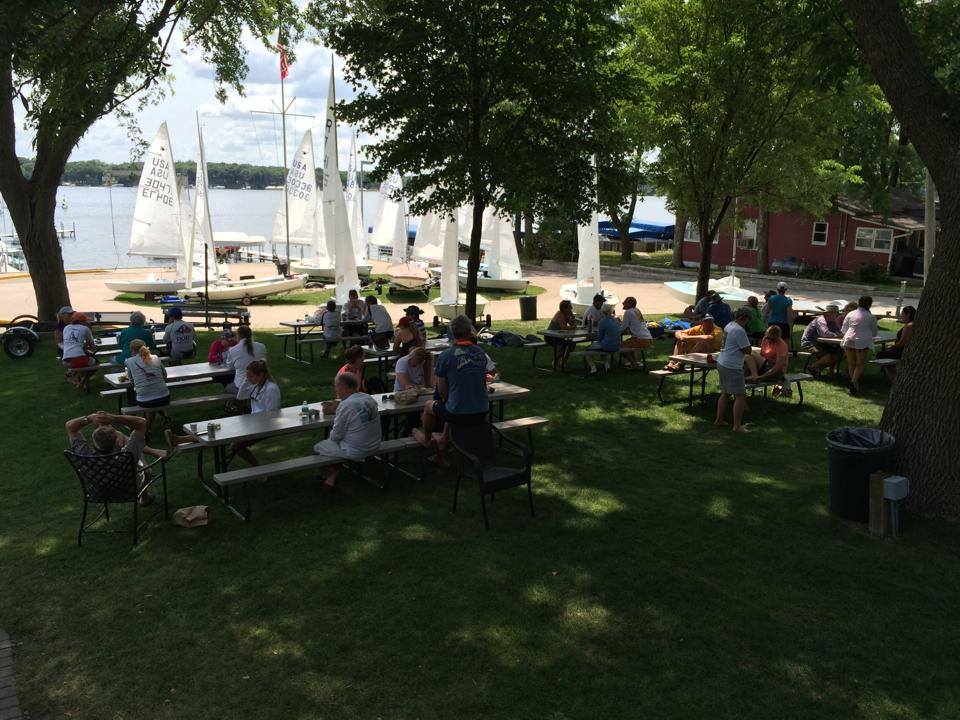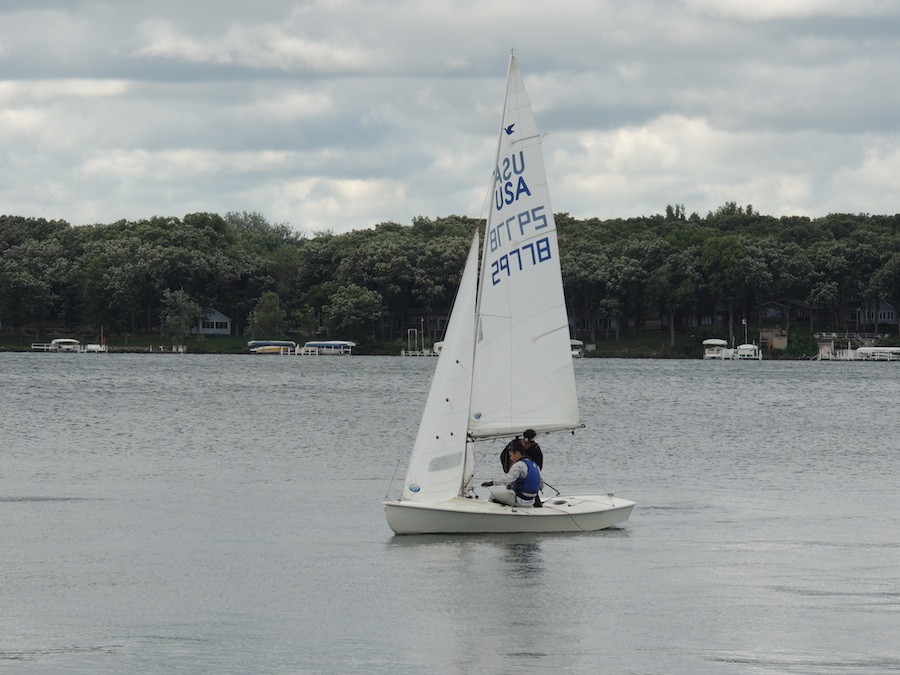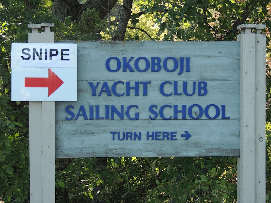 Okoboji Yacht Club is well-respected in midwest sailing circles, and the Race Committee did a great job fitting in the maximum possible number of quality races. The wind committee did not do such a great job and failed to whistle up a sailable breeze at all for the last two days. Fortunately, the RC had correctly predicted this and started off with three races on Monday. (The third was after a leisurely lunch break on shore.) Two races each on Tuesday and Wednesday gave us a very respectable seven race series. And somehow the expected heat and humidity never appeared, though the extremely pleasant conditions for sitting around were undoubtedly related to the lack of wind.