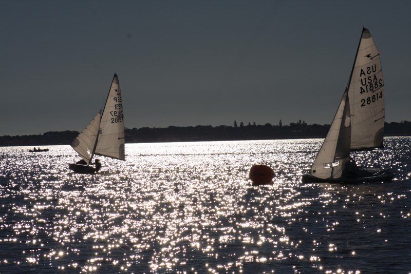 Our fleet is hosted by the St. Petersburg Yacht Club on Tampa Bay. This is a wonderful place to sail! You can sail year-round, but the best sailing is in the winter-spring when sea breezes are steady and predictable. In the summer we sail late in the day, usually after the thunderstorms reside and many starts are as late as 6 PM (picture). In the fall, the weather is dependent on fronts moving through from the north-west, so winds are variable and temperatures ranges from cool (50’s F) to warm (80’s). Even then, the water temperature rarely gets below 65 F. From February to May, sea breezes kick in from the west almost every day with the strongest breeze in March and April. Usually, our club hosts a major regatta every weekend from Valentine’s Day through mid-May. The biggest problem for our fleet at that time of year is getting our share of days with access to the water with the crowded waterfront.