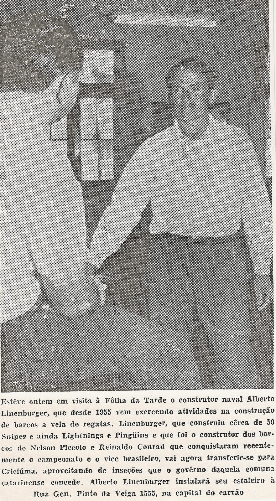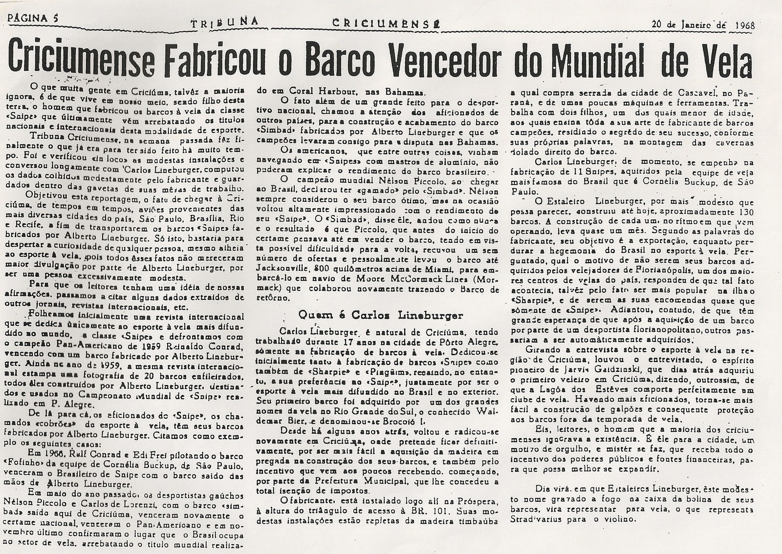 No ano de 1967, Nelson Piccolo e Carlos Henrique De Lorenzi vencem o Mundial de Snipes nas Bahamas. O barco da conquista era um Lineburger. Isso, propiciou uma matéria na Tribuna Criciumense, assinada pelo saudoso Dr. Gundo Steiner. Nessa matéria Alberto Lineburger salientava as condições especiais da Lagoa dos Esteves para a prática da vela.