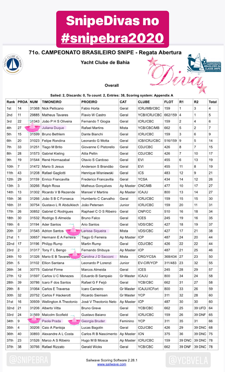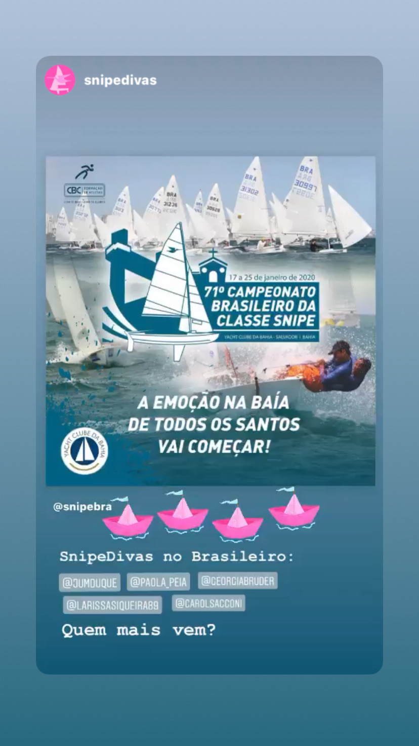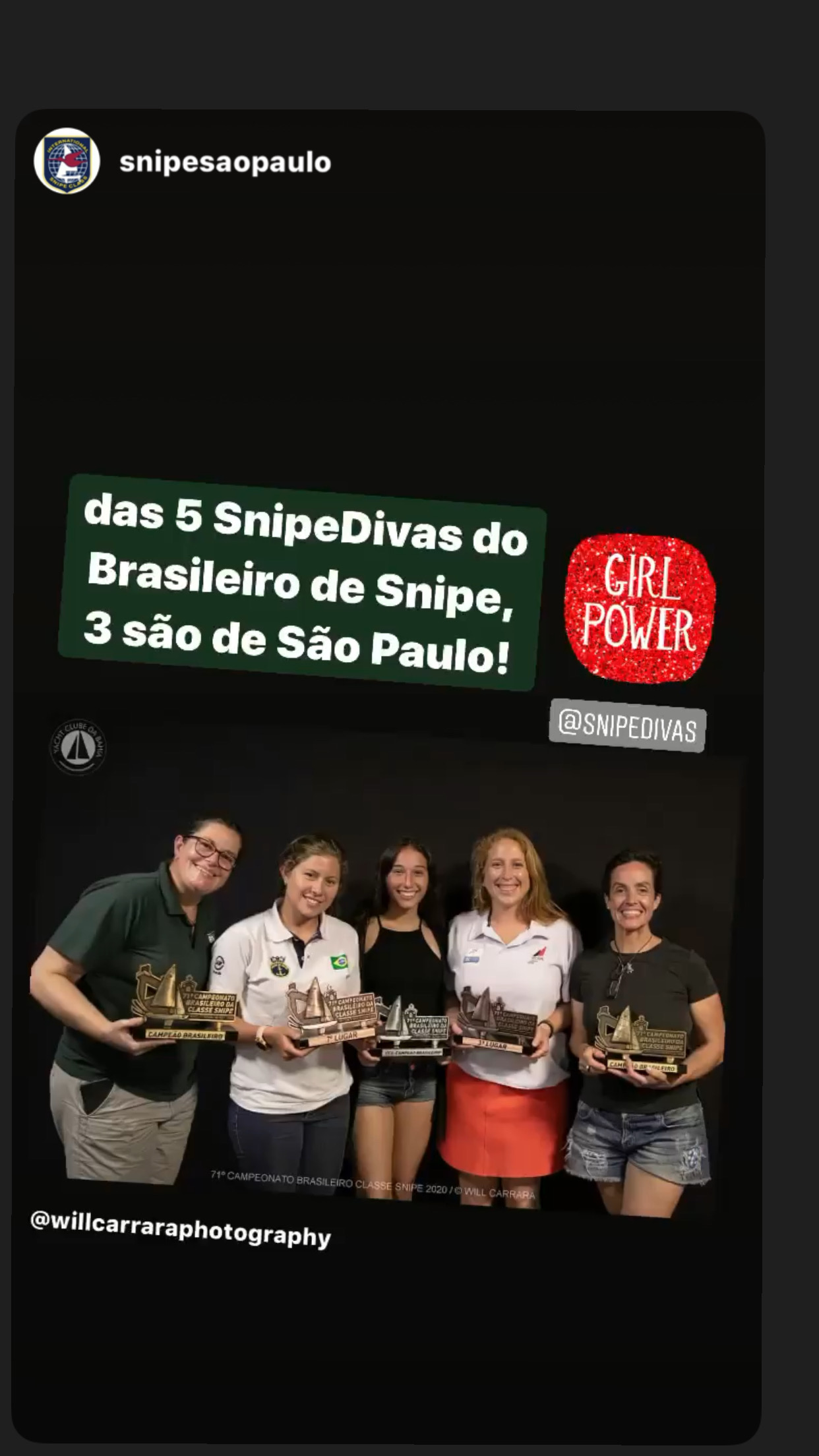 The SnipeDivas are always ready to welcome their peers; you just need to show up at a regatta and the divas will promptly add you to the group. We exchange ideas about adequate sailing clothes, the best sunscreen protection, what shampoo to use to recover your damaged hair after sailing, in addition to tips about sailing.
