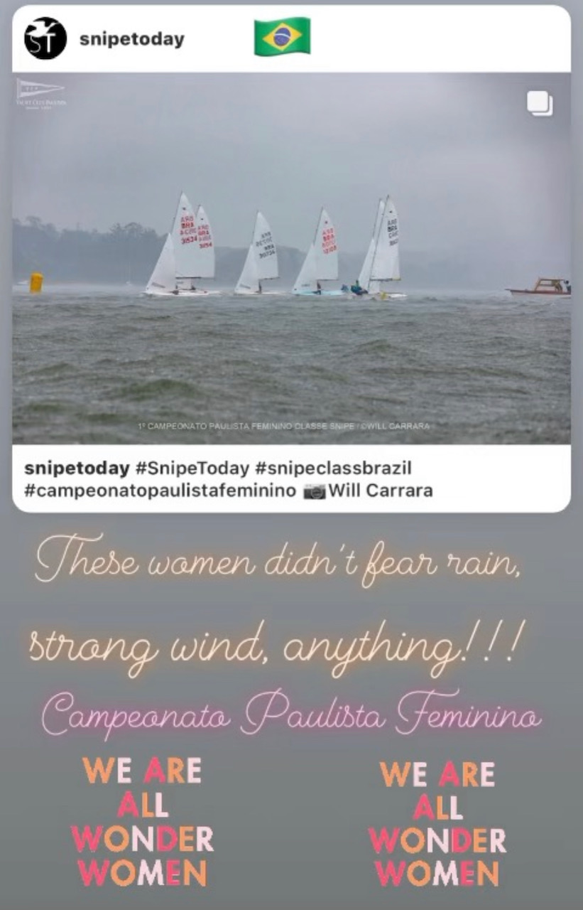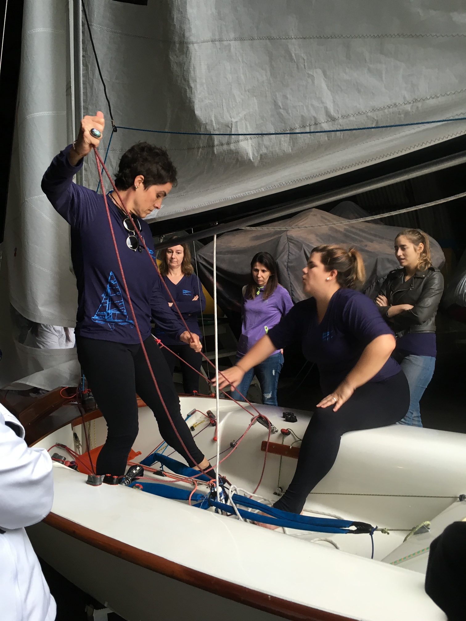 One day in 2016, we were talking in the snack shop at our Yacht Club Paulista. We commented that some of the women that crewed for their husbands needed a more patient training, another point of view, or someone who could explain to them how to move around in the boat. At that moment, we decided to organize the first “women only” Snipe clinic.