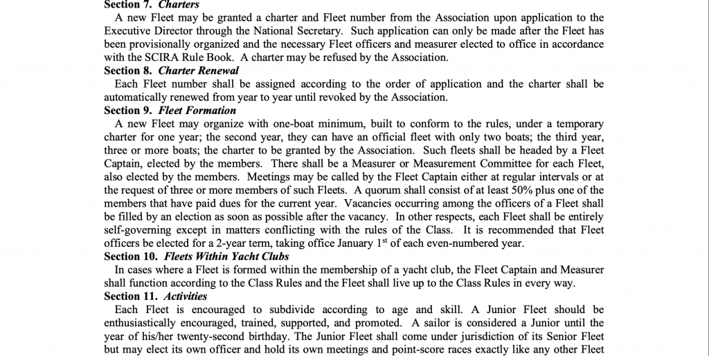 The SCIRA Constitution places the Fleet at the core of its structure. The Association consists of members “usually organized into Fleets,” which may represent a single yacht club or several clubs in a region. This local organization is crucial for several reasons: