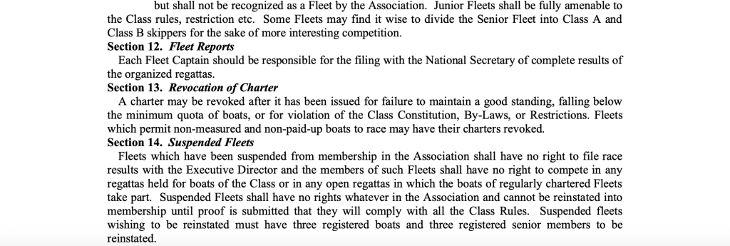 A Fleet’s charter, granted by the Association, formalizes its standing. While a new Fleet can be provisionally organized with a single boat for its first year and two for the second, an established Fleet must maintain three or more active boats to keep its charter in the third year and beyond.