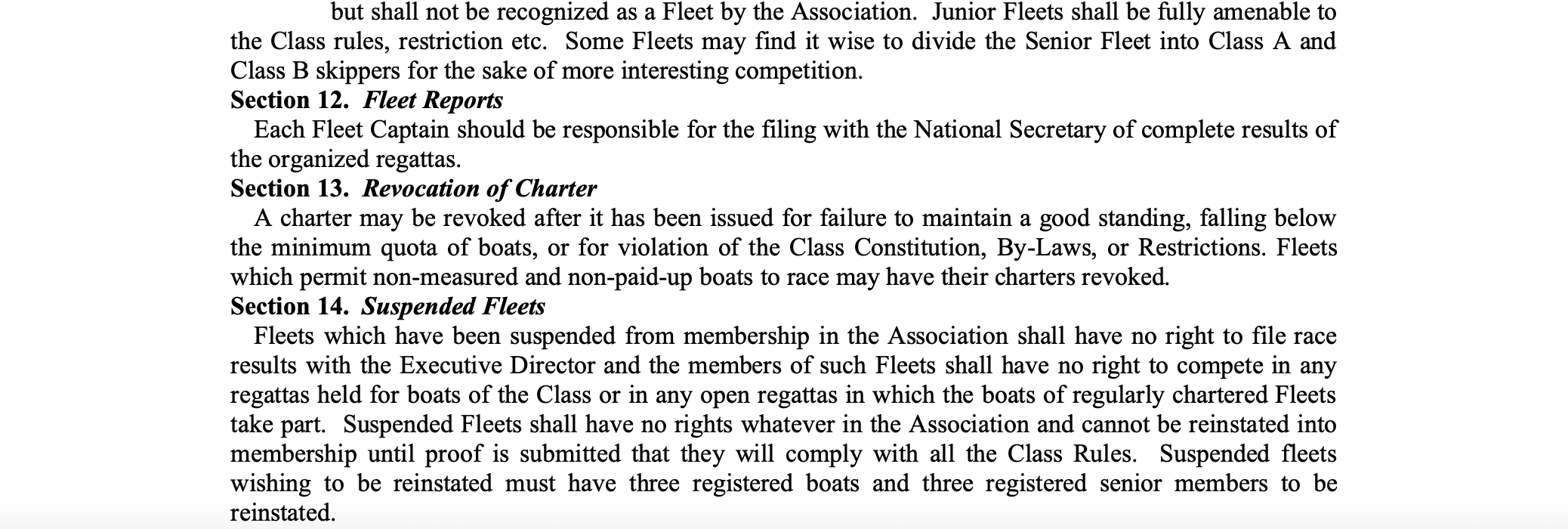 A Fleet’s charter, granted by the Association, formalizes its standing. While a new Fleet can be provisionally organized with a single boat for its first year and two for the second, an established Fleet must maintain three or more active boats to keep its charter in the third year and beyond.