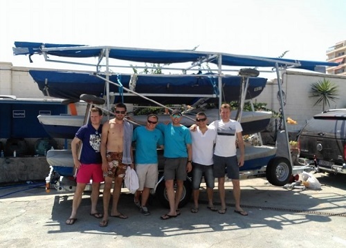 Another funny moment, however not during a regatta, but during the preparations of the Europe Youth Europeans in 2003, happened to me in Ribera. Our routine speed tests got disturbed, when not expected. All of sudden my rudder started to shake as also instantly my speed dropped drastically. When I looked up I saw my partners and me got lost in a carpet of jellyfish, as far as the eye could see. One could almost walk from one boat to another. It took some us time to get out of it. Swimming was not recommended.