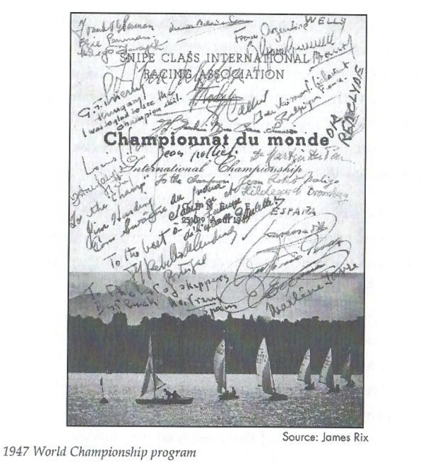 A few regattas in the early ’40s had participants from other countries making them informal international regattas including one in 1946 at Lake Chautauqua, New York. Sailors from Brazil, Newfoundland, Portugal, and Switzerland participated as well as many from USA fleets. Dr. Martin Dupan, representing Switzerland, was so impressed with the regatta at Chautauqua, New York, that he became the initiator for the first world championship to be held outside of the US in Geneva, Switzerland in 1947.