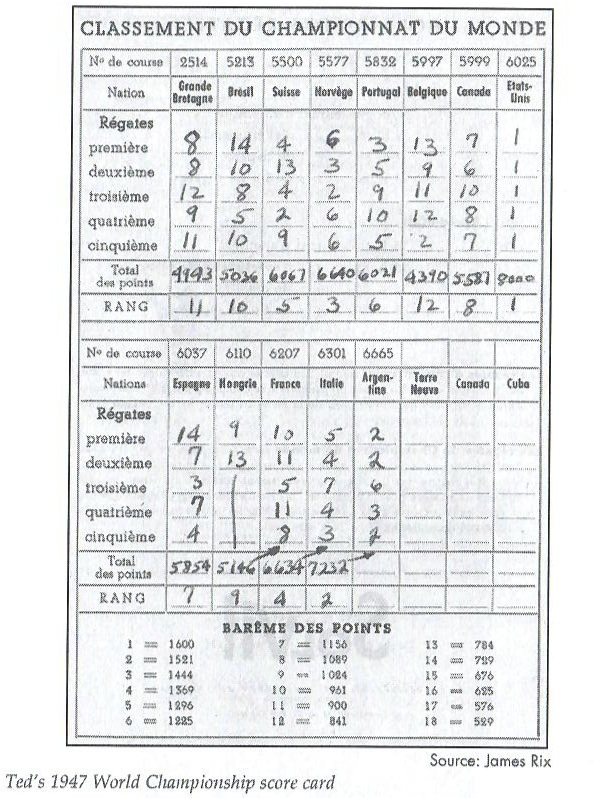 From the book "Master of the Sky and Sea – The Story of Ted Wells" by James Rix A few regattas in the early '40s had participants from other countries making them informal international regattas including one in 1946 at Lake Chautauqua, New York. Sailors from Brazil, Newfoundland, Portugal, and Switzerland participated as well as many from USA fleets. Dr. Martin Dupan, representing Switzerland, was so impressed with the regatta at Chautauqua, New York, that he became the initiator for the first world championship to be held outside of the US in Geneva, Switzerland in 1947. This was the first invitational contest just between the national champions from different countries. Since Ted had won the US National regatta, he qualified as the United States representative to the World Championships. ...