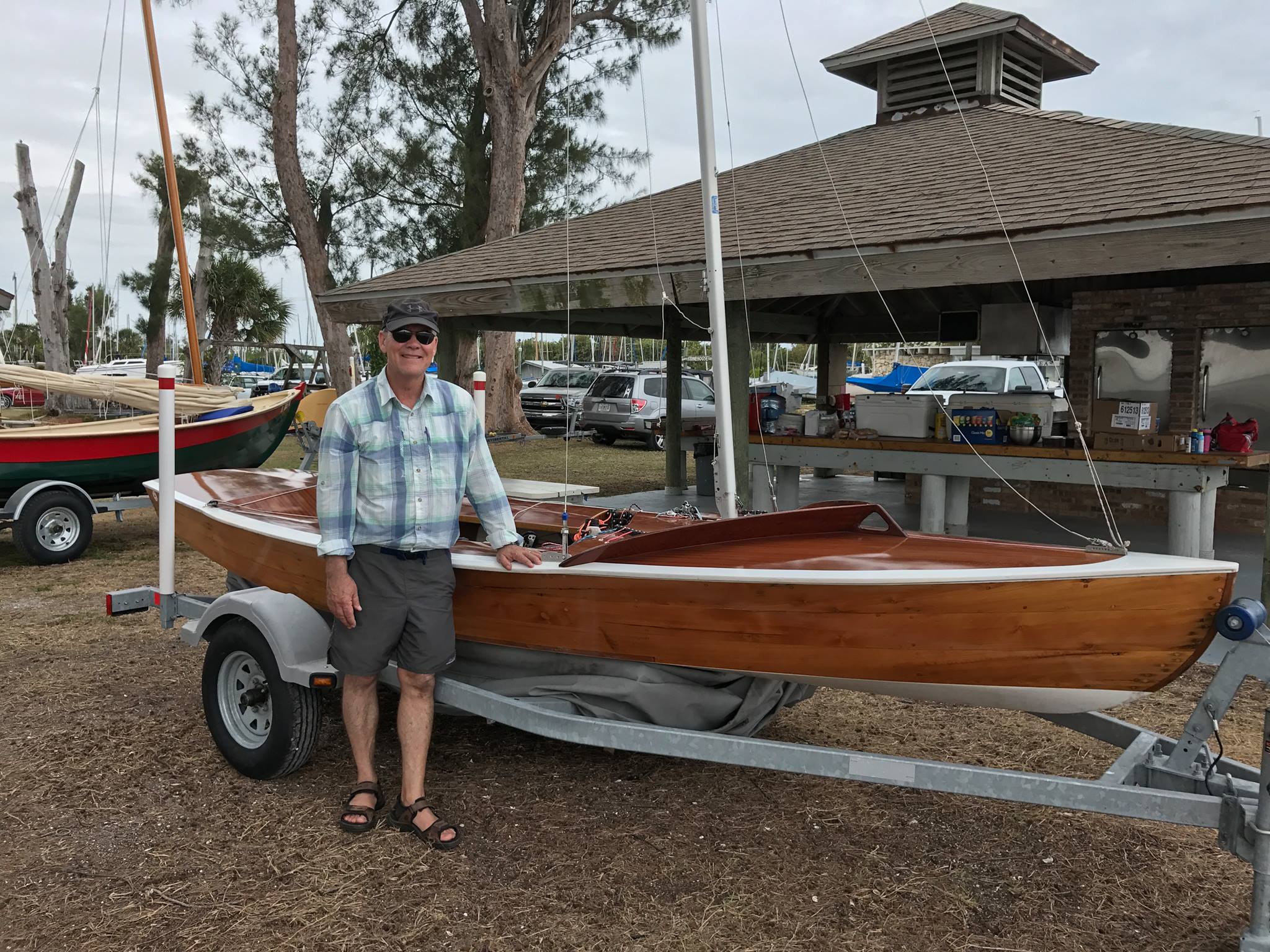 It is now under the watchful care of Michael Jones (pictured) of Clearwater Florida, who is the shop guru at McKay Creek Boat Shop at Pinellas County Heritage Village in Largo Florida. Francis Seavy’s famous 1948 Mills Snipe #6995 “Honey” is also displayed at the McKay Creek Boat Shop; and Jones is working on restoration of another famous 1951 Mills Snipe #8570 in the shop. The shop is a replica of the boat shop that Clark Mills had in Dunedin Florida when he began building Snipes there in the late 1940s, after WW II.