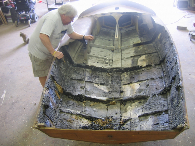 I thought some would be interested in seeing this famous Clark Mills-built Snipe – originally owned by Harold Gilreath, 1956 SCIRA Commodore. It was partially destroyed a number of years ago in an accidental shop fire while stored at McLaughlin Boat Works in Tennesee.