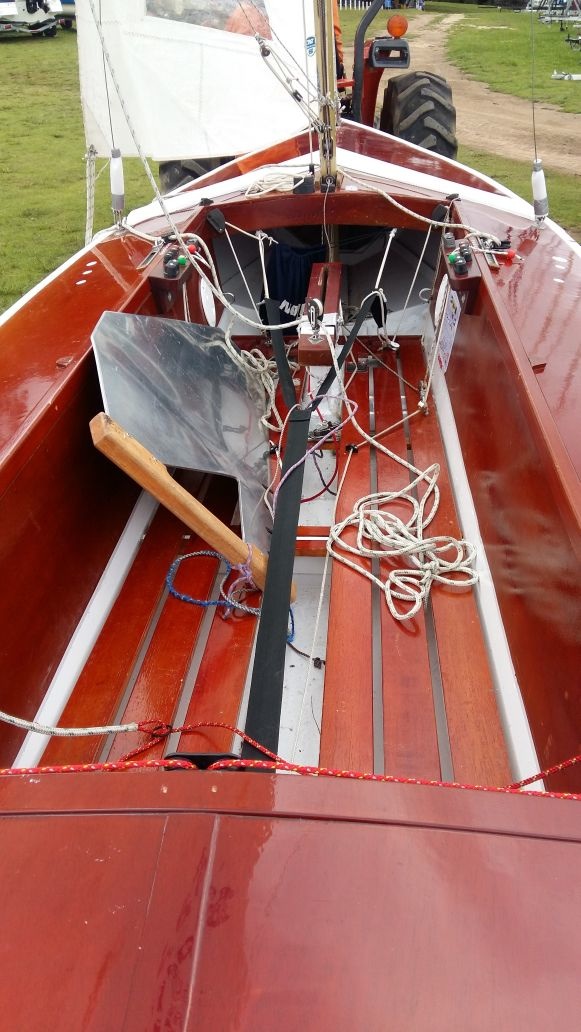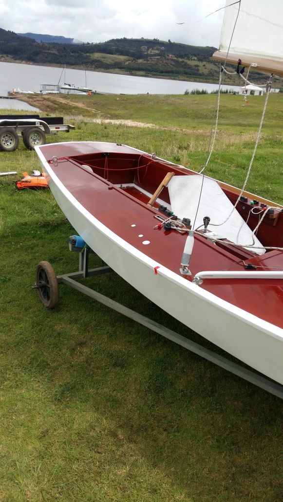 1967 wooden Snipe, restored three years ago. The boats is actively sailing in Lake Tominé, Colombia. She is a very fast boat and is adapted for the current regattas.