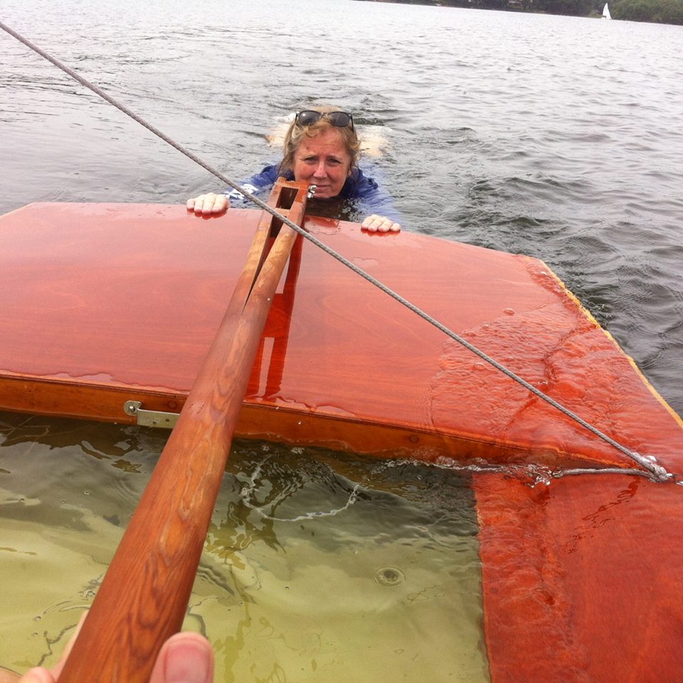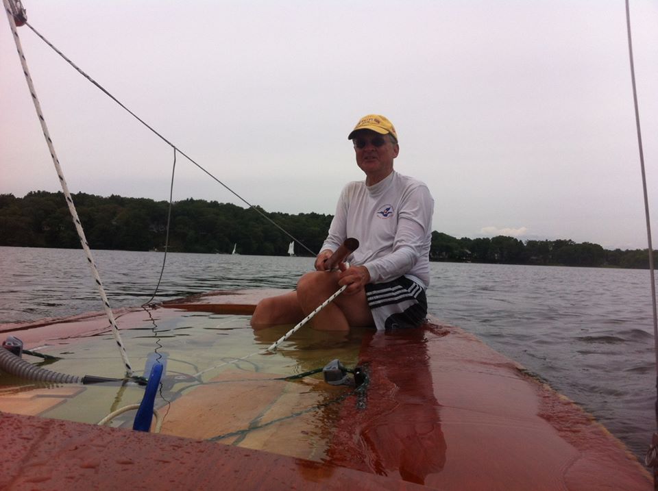 “At long last, today’s fleet race marked the first day that Snipe # 3258, masterfully restored by Roy Terwilliger of Cape Cod MA, touched the water in who knows how long. She handled beautifully in the mild breeze. That is until misfortune resulted in a capsize. Prior to this, I had never sailed a boat with zero freeboard, but it is quite an interesting experience, made possible only in conditions where there are no waves. I guess I could have gone with the story that this was an intentional method of soaking a wooden boat to expand and fill her joints, but Jennifer and I had so much fun with this new adventure that I feel compelled to go with the truth.” Roy Terwilliger