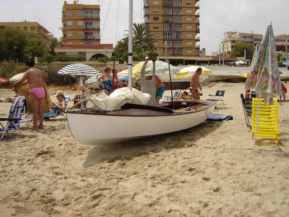 In 1993 Hugo replaced the original deck damaged by a tree that fell down during a storm. During the holidays Hugo and Annie sail in Oropesa del Mar, Spain (photo on the beach).
