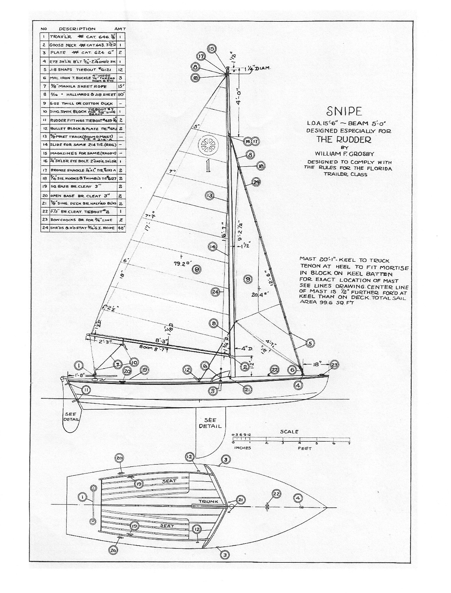 Note the original plan showed a spoked wheel as the insignia on the mainsail, for the “Trailer Class” which was the original symbol selected, quickly changed later to the Snipe bird insignia.