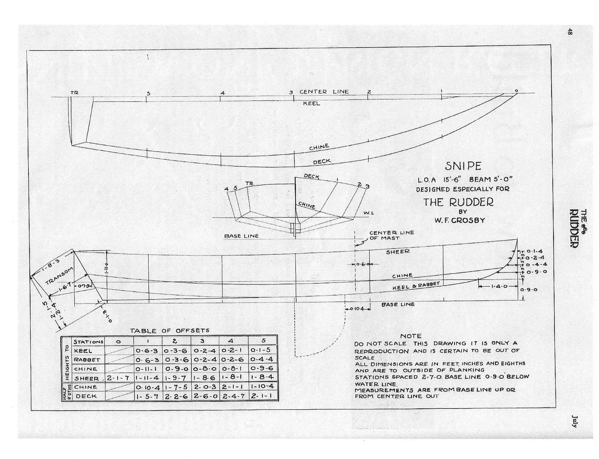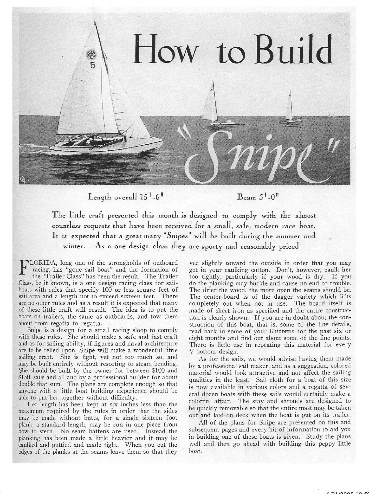 In March 1931 , in Sarasota, Florida, Bill Crosby promised the Florida West Coast Racing Association to give their proposed Florida Trailer Class a send-off by designing and publishing boat plans in “The Rudder”. The Florida Trailer Class – luckily renamed Snipe – was featured in July 1931 in “The Rudder” and the issue quickly sold out.