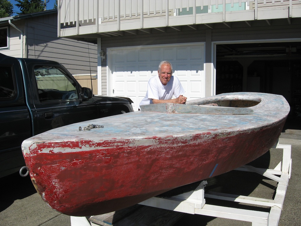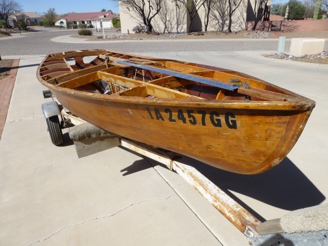 #16228 “Half Breed” (photo above) – in 1966, now famous Snipe sailor Earl Elms was just getting ready to compete in the Snipe class, by building his own wooden Snipe for competition – #16103 “White Trash,” with which he won his first Snipe US National Championship in convincing fashion, in 1966. He also built another new wooden Snipe at the same time (#16228) for a young San Diego, California Snipe sailor – Tom Nute, who raced the boat in many Snipe events on the west coast of USA. These two boats were so successful in racing that California Snipe sailor Herb Shear used the construction ideas and hull shape for these two boats in building newly-introduced Chubasco Snipes which won many national and regional Snipe events from 1967 and after. Over 1000 of these Snipes were built in following years, both with wooden hulls in early years, and fiberglass hulls introduced in late 1966. The first fiberglass Chubasco Snipe (#17152) to win a Snipe US National Championship was in 1967, with Earl Elms sailing. So these two wooden Snipes (#s 16103 and 16228) were the prototypes for all of the Chubasco Snipes that followed. #16228 has a varnished planked hull and varnished plywood deck, and restoration has started but will be completed in a future year.