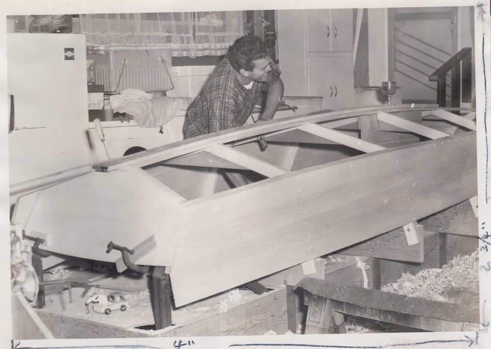 The black and white photo is a rare one, showing Earl Elms building his own first winning Snipe #16103 “White Trash” in 1966. Both that boat and #16228 were built by Elms as sister boats. #16103 won the 1966 Snipe US National Championship, the last wooden Snipe to win that event. Both Snipes were prototypes for the later Chubasco Snipes that were built soon after, near San Diego California USA.
