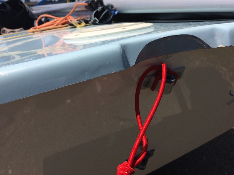 While the boat was upside down, the rudder had popped off—in spite of a very stiff and secure rudder lock. (As a result, I highly recommend tying in your rudder; see a photo below of the shockcord arrangement I use on my own boat.) The safety boat retrieved the rudder, and I was able to get it onto the gudgeons thanks to Brian swimming the bow into the wind. Since the boat was rolling around in big waves, I doubt it would’ve been possible to get the rudder installed again without that assistance.
