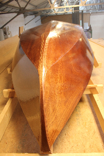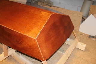 The plans came and I began immediately. First I made a frame on which I mounted the inner structure of the hull. Then I mounted the plates of plywood ( 9mm mahogany Bruynzeel, 15 years guarantee). The Snipe is one of the first dinghies specially designed for plate material. When the wooden structure of the hull was finished I put on a glassfibre reinforcement with epoxy. This makes the hull stiff and strong. On the hull are 6 layers of epoxy and 5 coats of varnish. After turning the hull, I made a hole for the daggerboard.
