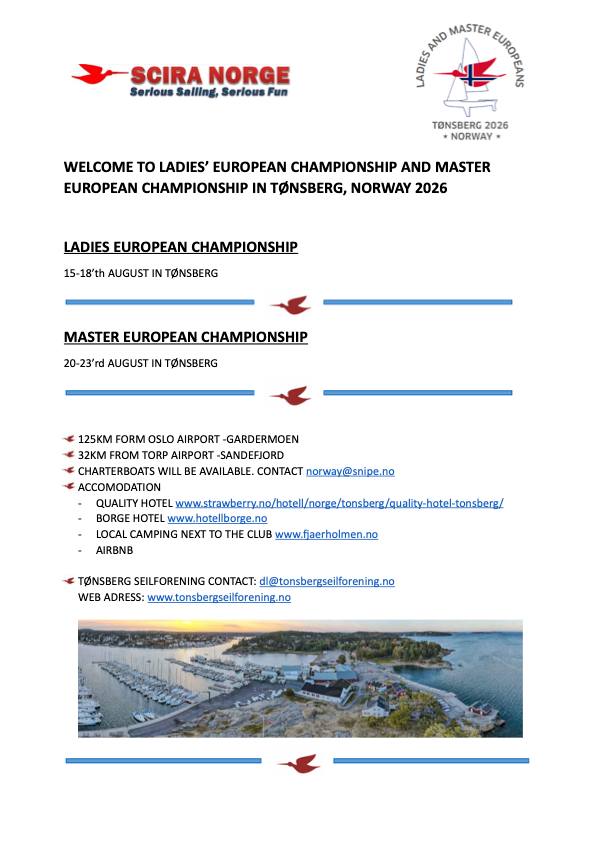 - SWEC (Snipe Women’s European Championship) – Tønsberg, Norway, August 15-18, 2025