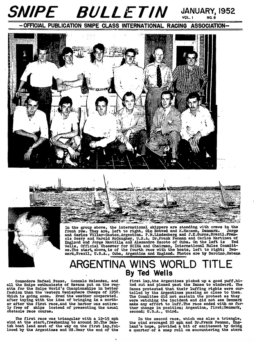 In 1951 in Havana, Cuba, Carlos, crewing for his brother, won his second Snipe World Championship. In the same year, the Castex brothers were Gold Medalist at the very first Pan Am Games held in Buenos Aires.