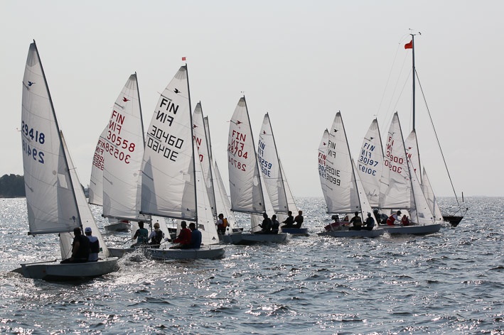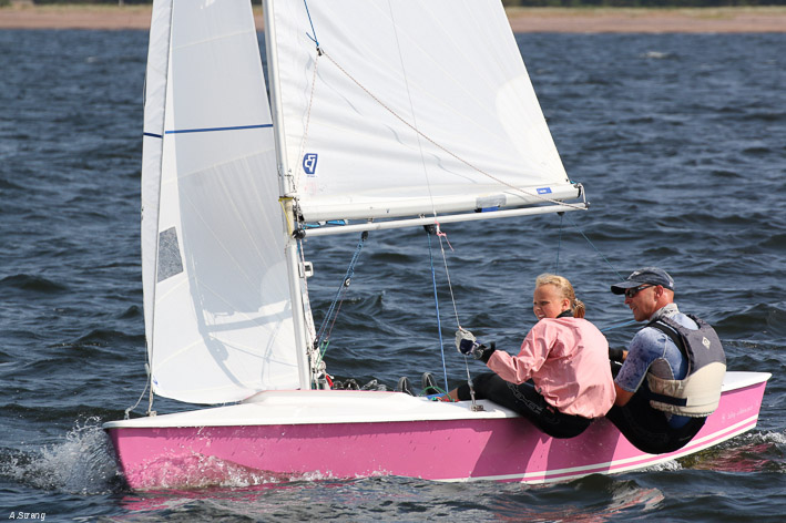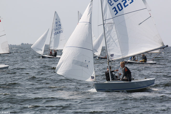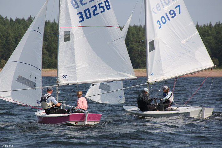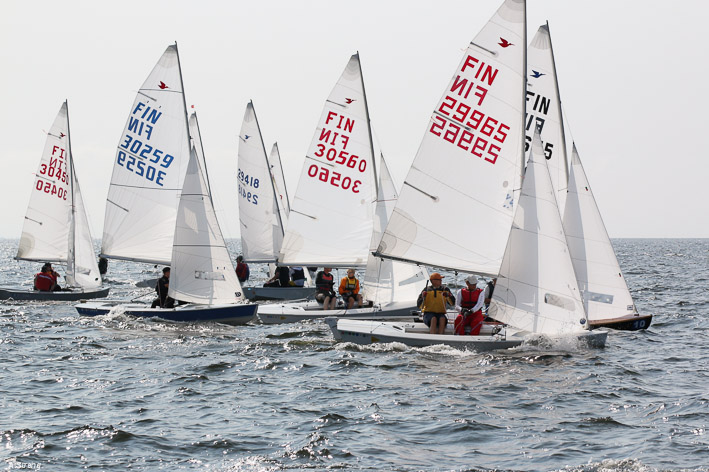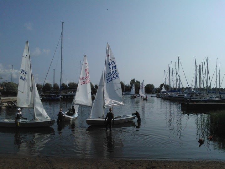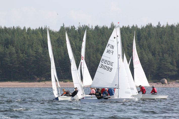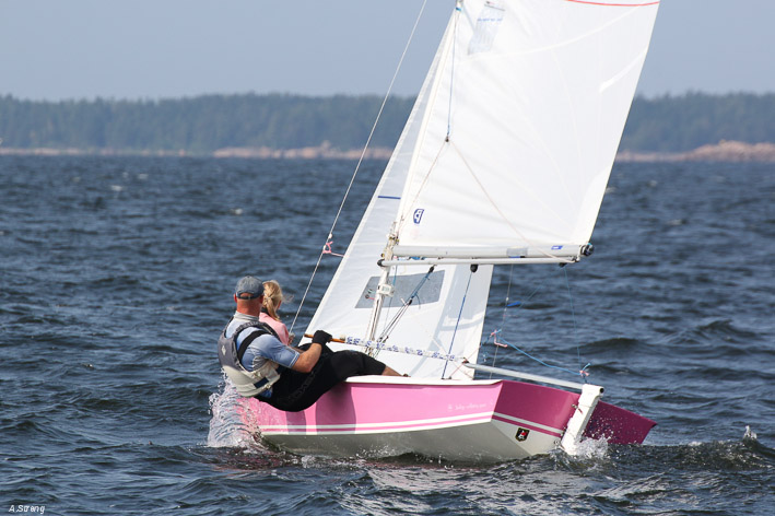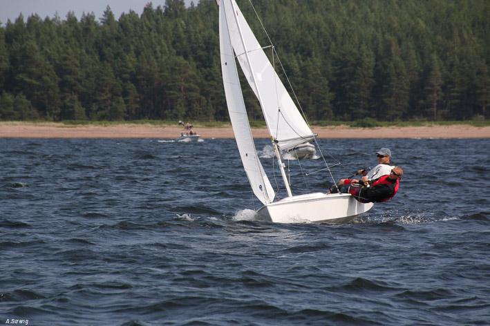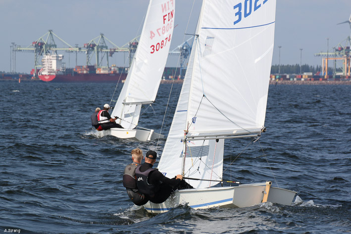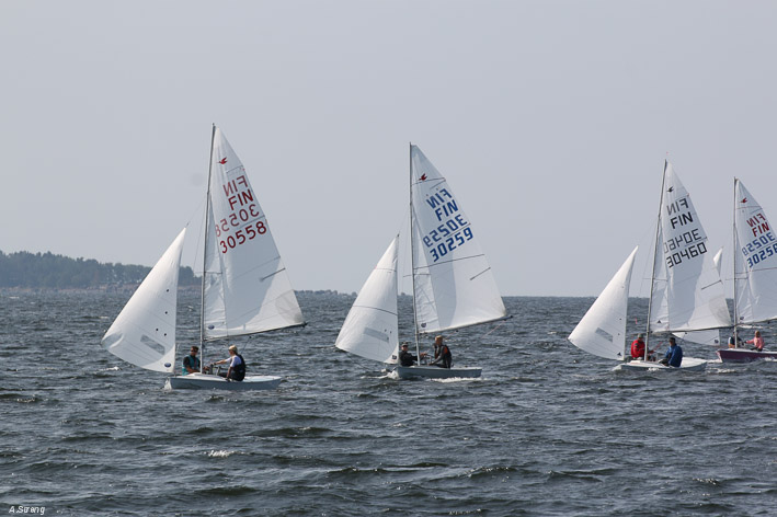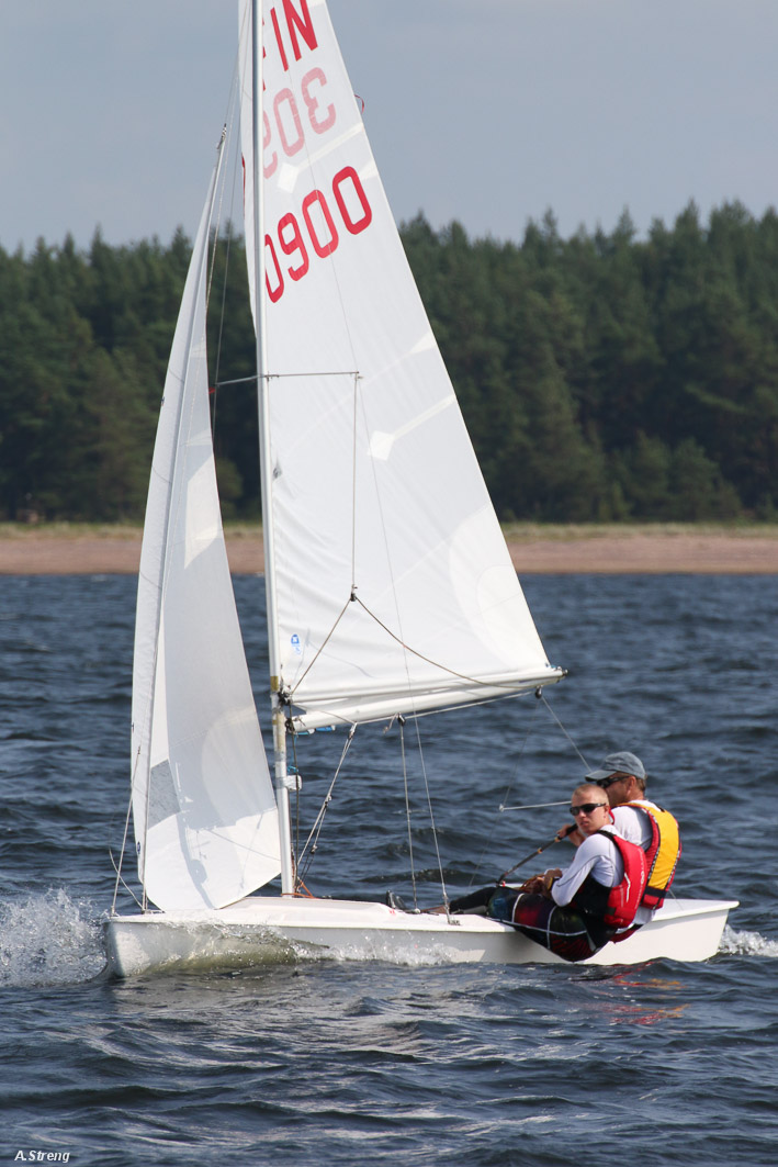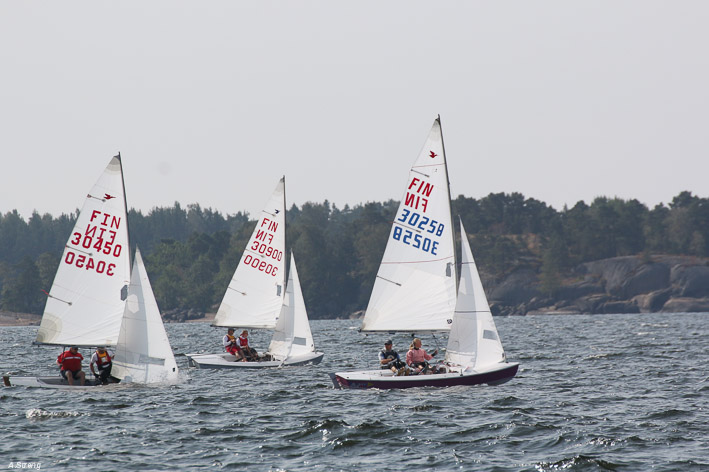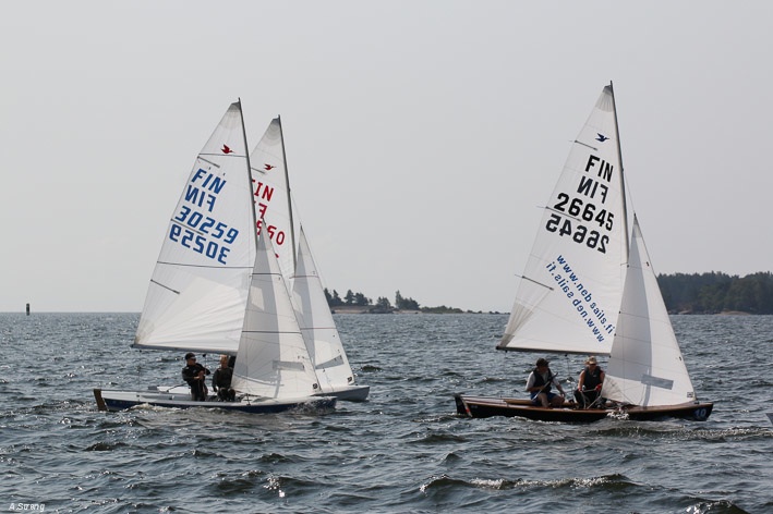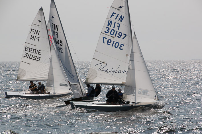 Wind 8.14 knots. Ville with his daughter leading one point before Claus and Risto. Petri did not succeed replace his broken mast in time. But he finished job in afternoon and will race on day 3. Nice dinner at 125 years old Kotka Sailing Club with live music.