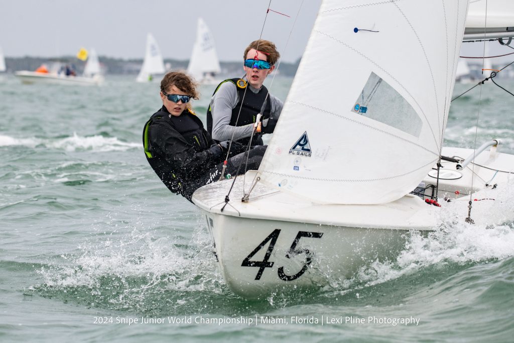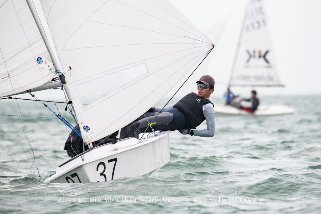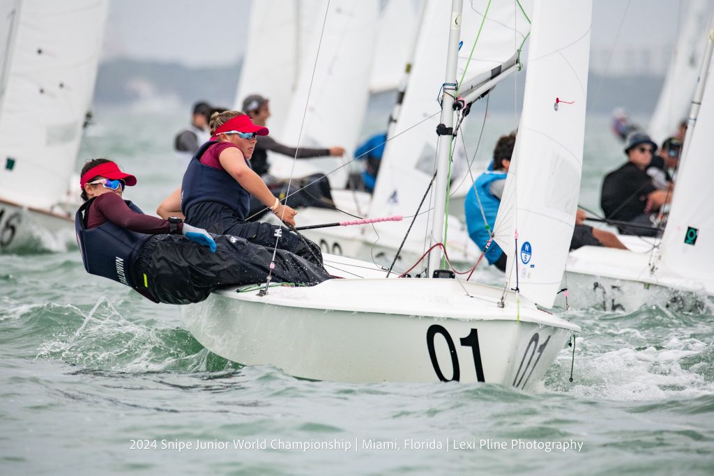 Biscayne Bay was grey and choppy for day four of racing at the 2024 Snipe Junior World Championship – and while the sky wasn’t clear today, the podium is starting to be illuminated!