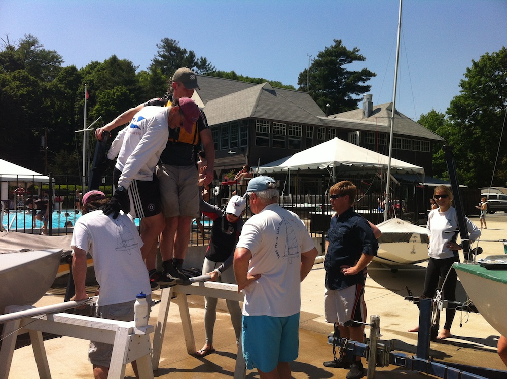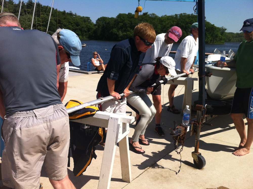 The answer to a bent mast is to…. DANCE! So dance the Mystic Lake fleet did. Bent mast owner Gillmore O’Neil and Art Rousmaniere started it off by going Gangnam style with carefully placed footing on the peak of the bend with the mast laying atop two saw horses. There was no shortage of eager helpers as well as of engineering analyses and surgical opinions as to where to exert the most pressure. The mast was rotated, examined, danced upon, assessed, and rotated again – over and over again for close to an hour. Sweat dripped from the dancers so alternate crews were recruited as relief. John Lally, Kerry O’Brien, Bill Swanton, Bob Coyle and guest Jesse Combs, all took turns bouncing in unison, though some preferred the more traditional hand-belly-bounce technique. At last, the reward was a straight metallic stick, as decreed by inspector Kerry and a much-relieved Gilmore.