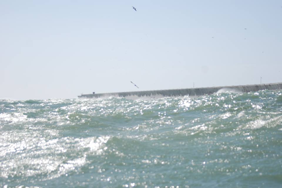 Early in the morning 2-3 knots from 340-350 that was going down during the morning and big waves from the 100-110. At 1300 the wind shifted to east (around 95) the same direction the waves were coming from since the morrning and then became 25-28 knots.