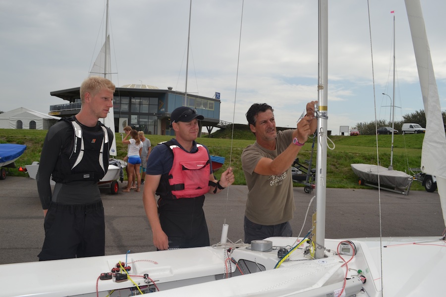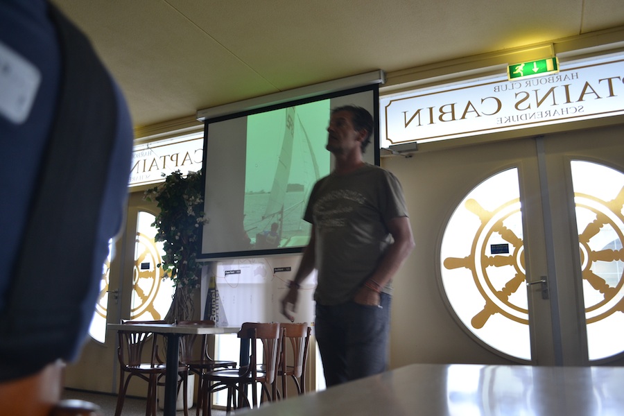 Day one started with a very interesting trim session. Damian introduced us in the secrets of mast trimming, setting of the jib barber haulers, sail trimming etc. After a short briefing, we went on the water to put all the theory into practice. We did a lot of short races with special attention for the trimming of the jib on downwind and reaching courses. We ended the day with a debriefing, in which videos and photos, taken during the day, were analysed.