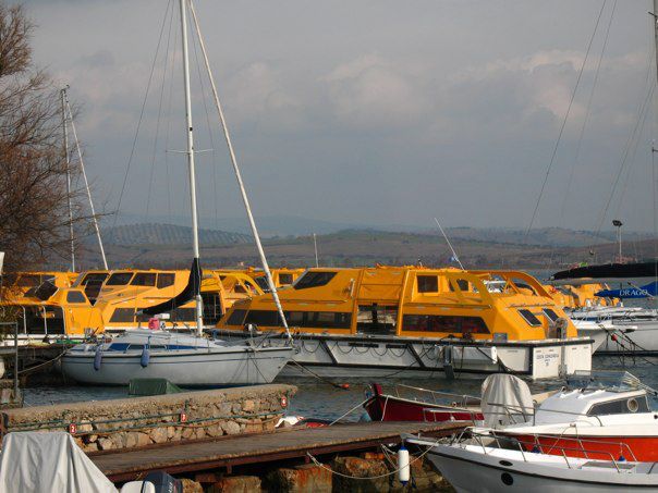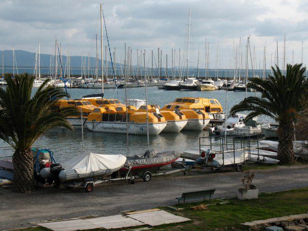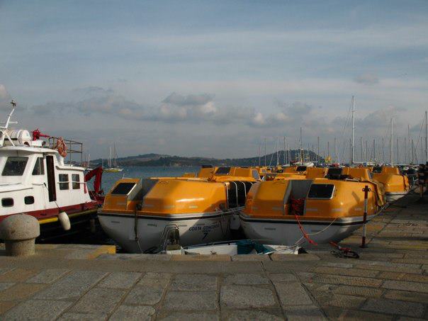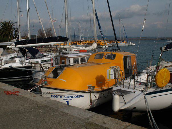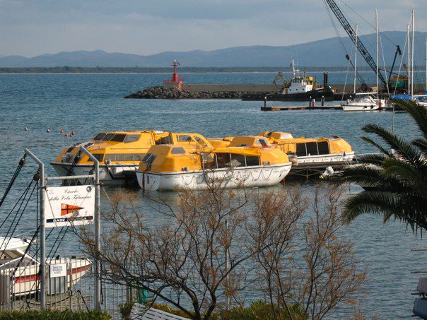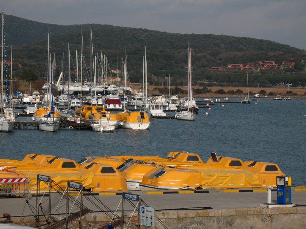 Le scialuppe di salvataggio della Costa Concordia sono ormeggiate a Talamone.