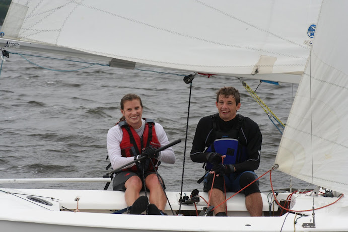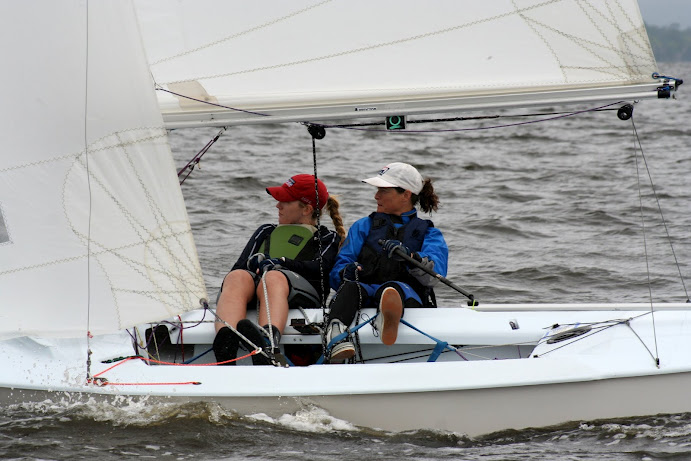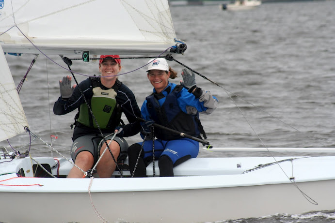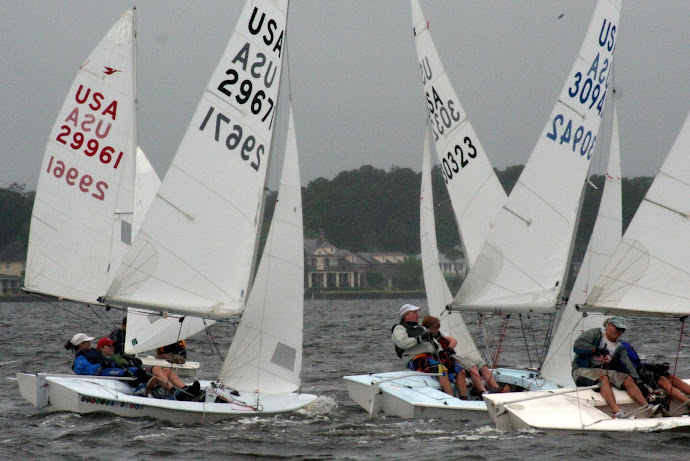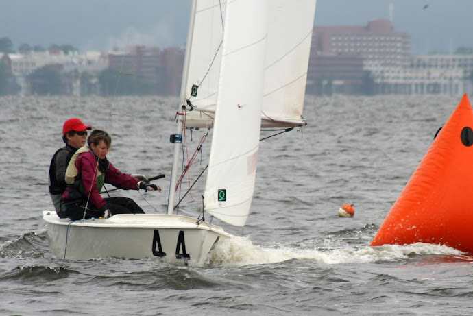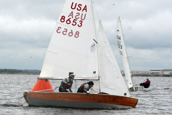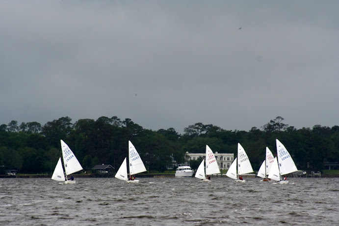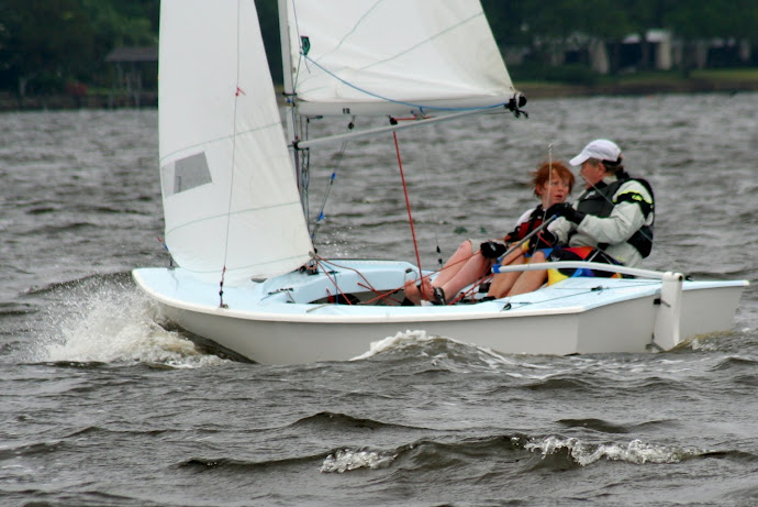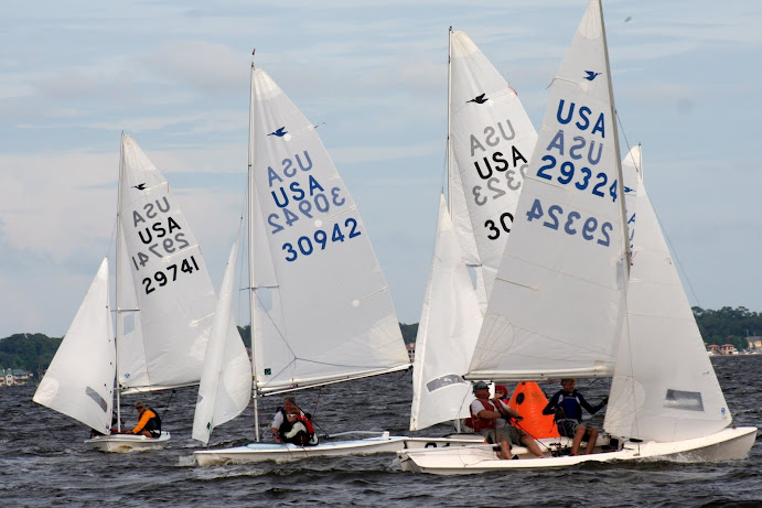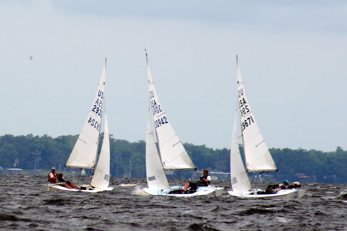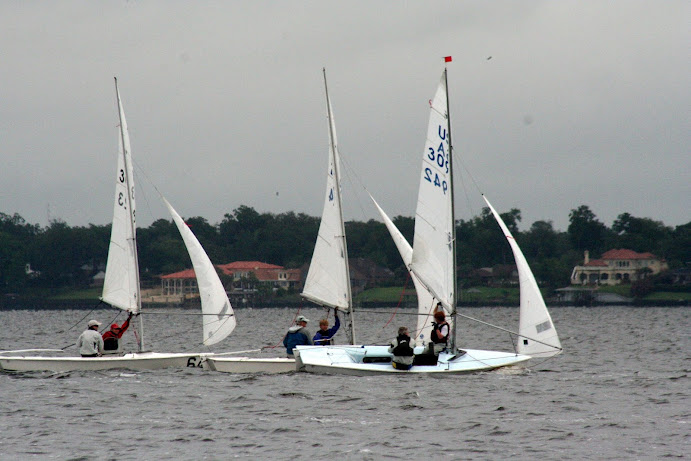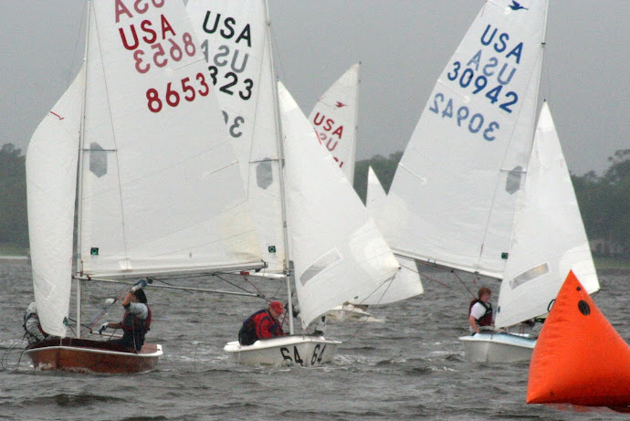 Jacksonville, April 21-22, 2012. Florida Yacht Club in Jacksonville hosted the 2012 Snipe Tea Party and District 4 Championships. After 7 races in everything from a light drifter, to waves and sea breeze, to flat water and oscillating breeze, Chris Klotz and Bobby Guilder came out on top. Chris and Bobby (local FYC junior sailor) never finished out of the top 3 and that consistency took them to the top of the fleet. In the first race, Hal and Emily Gilreath ghosted to a win in a light breeze passing David Muhlhaussen and Barb Evans up the last beat. A 10-15 knot sea breeze kicked in for the afternoon and David and Barb ended up tied after 4 races with Chris and Bobby. The compact races placed an emphasis on starts and crew work in the building breeze and waves. Saturday night the fleet retired to an Italian buffet as a front moved through.