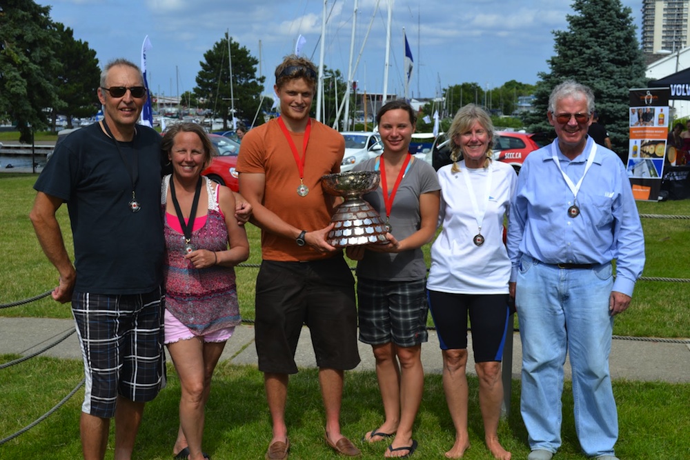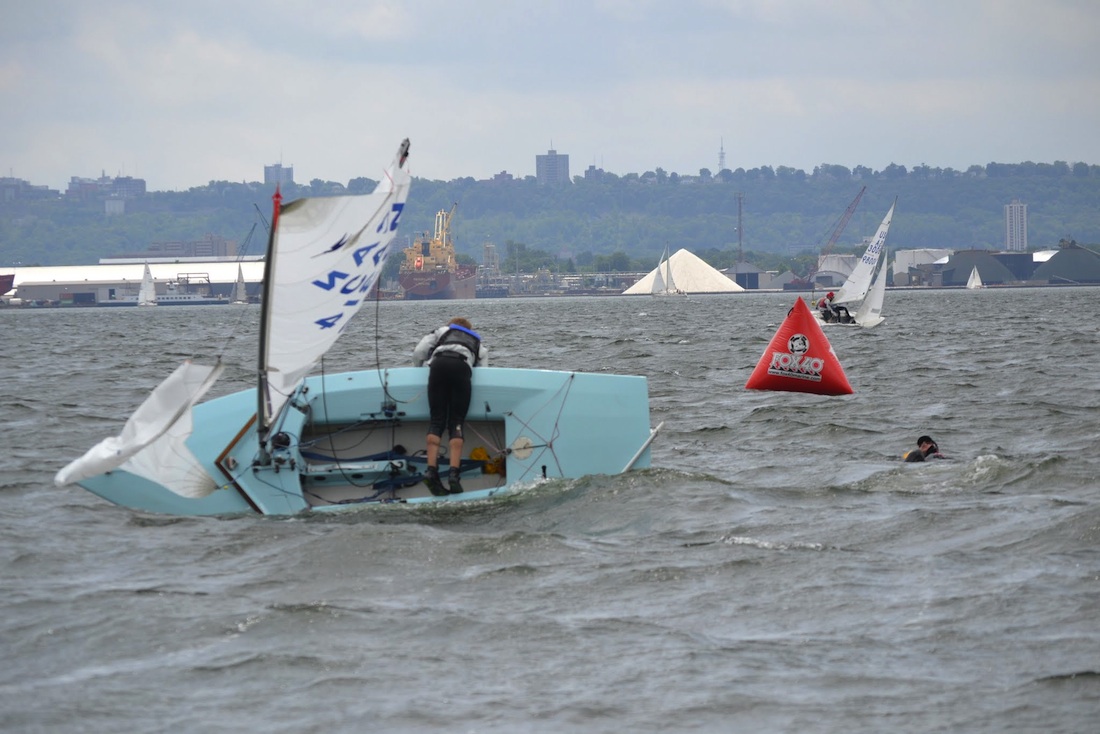 Sunday was the opposite of Saturday. Starting at 10-12 knots from the southwest and building all day to gusts in the 18 knot range, the racing was thrilling and eventful. Gear failures and capsizes did not dampen the competitiveness of the fleet. Andy Klein and Jessica Claflin were consistent with no finishes worse than a second in the entire regatta. That included going back to re-start after being called OCS in race 3. They win the Ontario Open with an impressive effort.