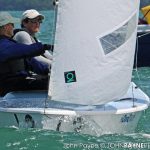 Sunday was the last day, and the race committee was determined to get in both remaining races. A problem was that several of the competitors were leaving that afternoon, with their boats, for Nassau, the third stop on the Winter Circuit. A ten o’clock first warning meant the racing might not get finished in time to pack up for the ferry. The first race started in a nice 12-14 knot southeasterly, under mostly cloudy skies. Peter Commette and crew Bruno Mello took the left side of the course and rounded the top mark with a nice lead on the Brazilians, Bethlem and Bianchi. They extended over the next three legs and won the race with a twelve boat length lead over Kamilar and Quintero. Bethlem and Bianchi fell back to third. Ernesto Rodriquez took fourth keeping him in the overall lead.