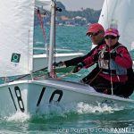 Day two began with a postponement on shore. The predicted sea breeze was late in arriving, which gave the sailors time to talk shop, with many of the more seasoned Snipe skippers offering rigging tips to the newcomers. This is another nice facet of Snipe sailing. Peter Commette said, “We all try to help everyone learn how to best rig and sail the boat.” He continued, “Just recently, Augie and I were helping Ernesto with the set up on his main sail. We discovered we had been using different standards for measuring mast rake settings. Once we figured that out, we got him dialed in, and look how well he sailed.”