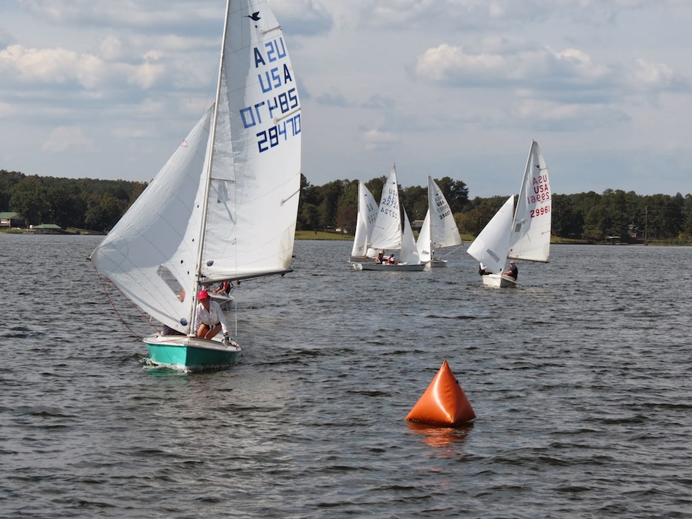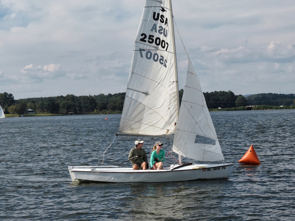 Sunday saw the typical Lake Logan Martin wind at dawn, blowing 0 from the North. Fortunately, we had Emily’s fresh pumpkin muffins to munch on with our coffee. By 9 the wind started to fill in enough for boats to sail out and the race committee to set up a course and start a race. By the end of that race, the wind dropped to nothing, so RC called the event. Boats were back to the dock by 10:30.