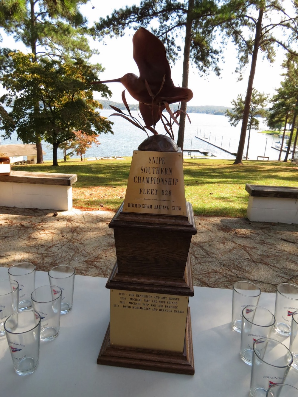 Birmingham Sailing Club, October 12-13, 2013. Report by Michael Papp The fifth annual second carnation of the Snipe Southern Championship was held at Birmingham Sailing Club on October 12th and 13th 2013. Eight boats were present to sail in the Championship and Cruising Fleets, with one start for both fleets. Seven races were completed on Saturday with temperatures in the mid 80s and the wind blowing 5 to 10 mph from the north. Once the wind settled in, it was a perfect day for racing. Since the wind was up and the wind prediction was not good for Sunday morning, PRO David Whikehart opted to run 7 races. This was especially good for our Cruising fleet, as ¾ of the sailors have been racing Snipes for less than a year. The extra starts and short courses gave them lots of practice.