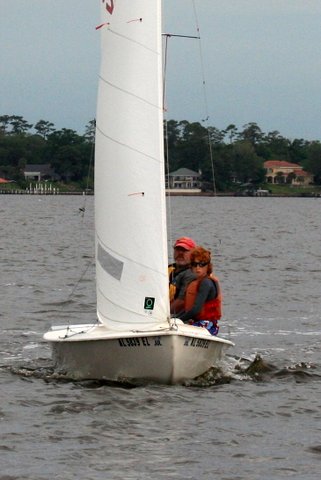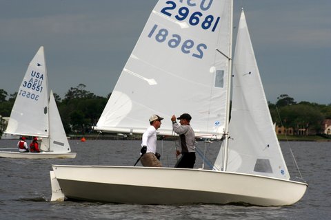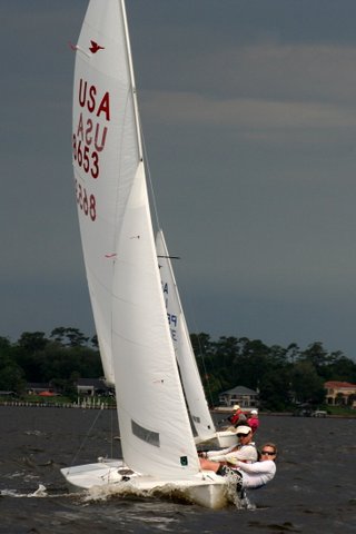 The highlight of the weekend was the socializing Saturday night around the FYC Low Country Boil. What a great and relaxing evening in beautiful weather. It was hard for Andy Klein to trade in his New England weather for a warm Spring evening on the banks of the St Johns River. The travelling Snipe Fleet was again in attendance w/ Don Hackbarth leading the charge. We were able to add three participants to our fleet thanks to this great program. Merrill Varn created some great beach towel trophies which helped dry off everyone as the Spring showers commenced on Sunday afternoon.