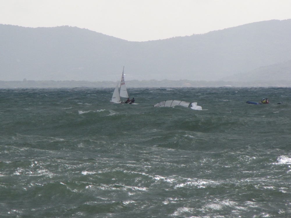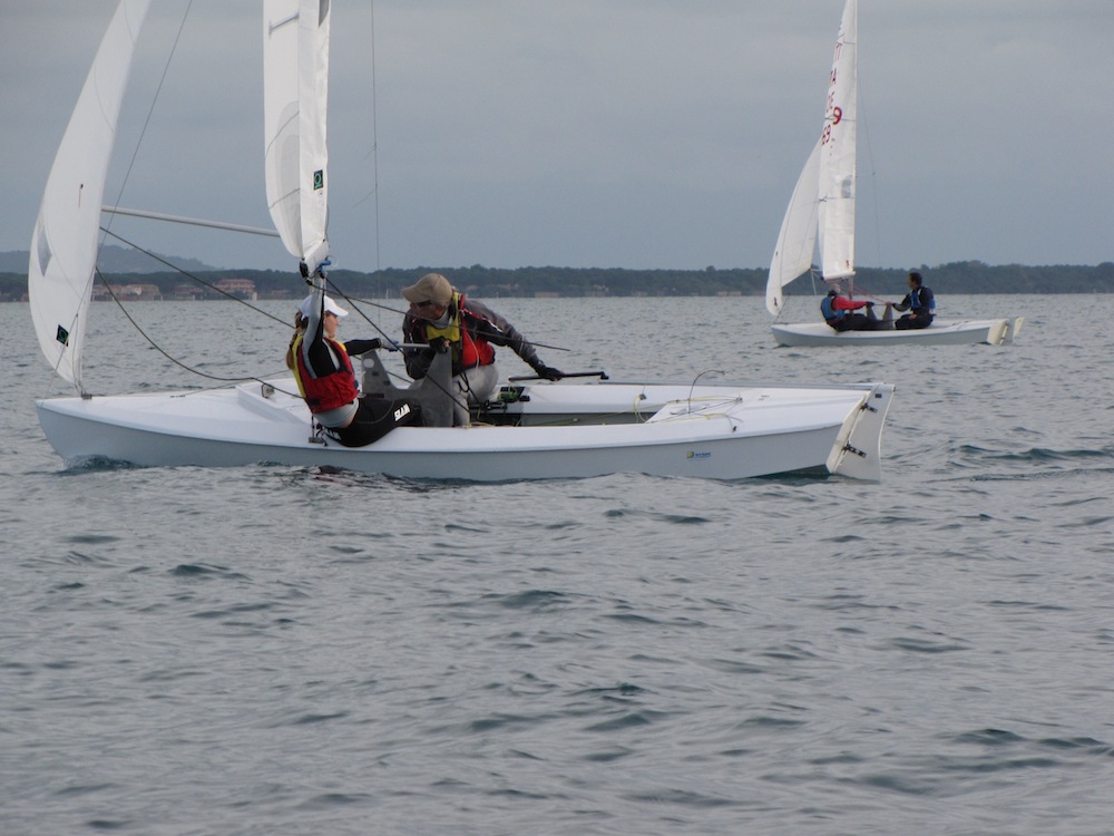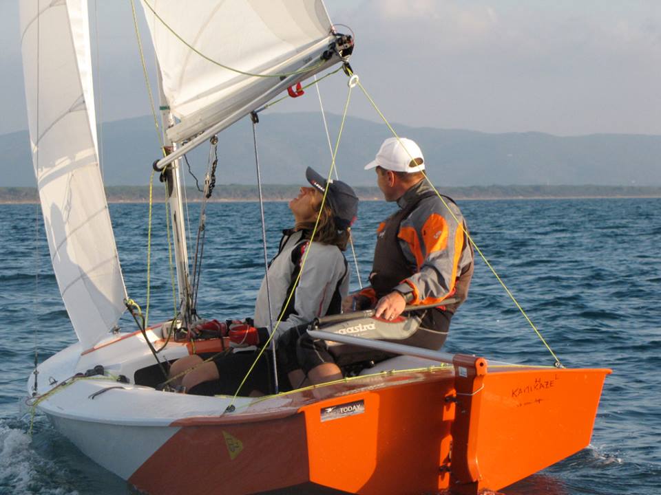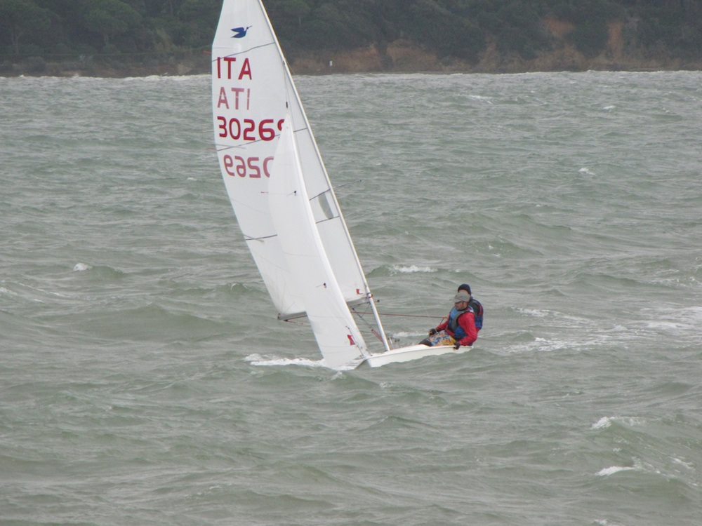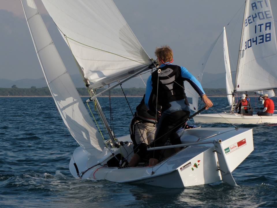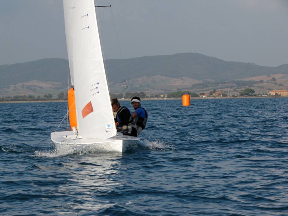 Unlike the cold temperature last year, sailors sailed the first two days in lycras under the warm Tuscan sun. On day one, three races were sailed in 4-7 knots of breeze and flat water. Pietro Fantoni (Moruzzo) and Laura Cerni (Trieste) displayed incredible speed , particularly in the downwinds. Pietro and Laura won the first two races of the day and Enrico Solerio and Sergio Simonetti finally showed their true speed to win the last race. Super Crew Daniela Semec (Trieste) and her fabulous skipper Fabio (Trieste) also had an excellent first day with two seconds.