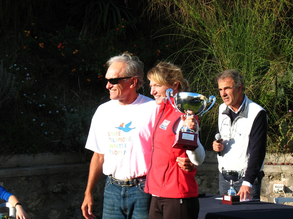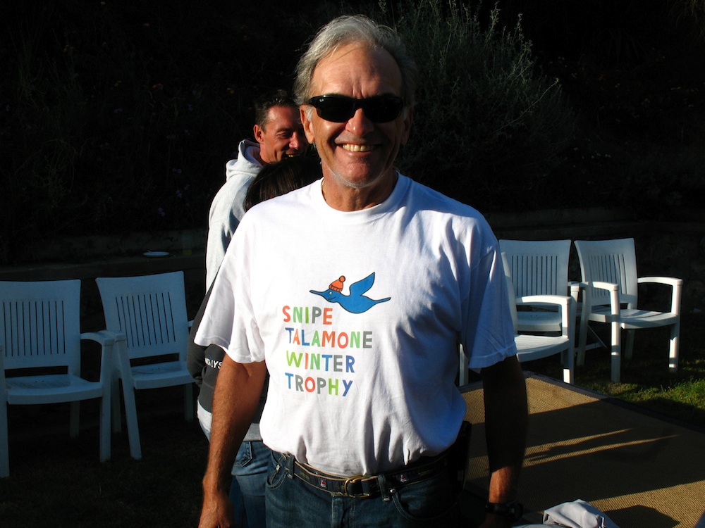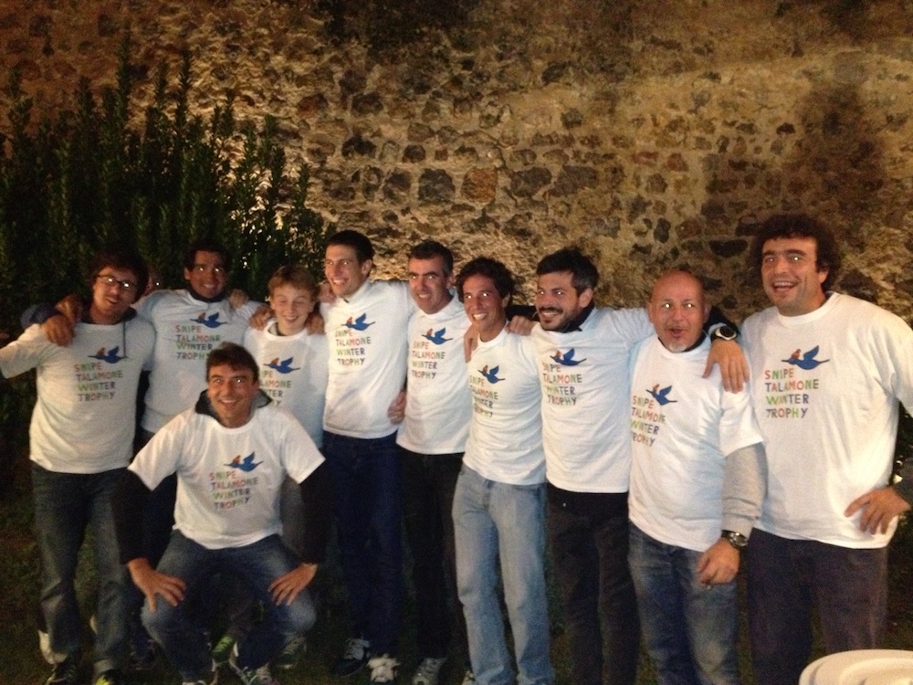 Saturday night was a classic evening in Talamone. The town hosted a traditional caldarroste – Vin Brulee (hot wine), hot chocolate, and roasted chesnuts – in the central Piazza. This was followed by a four course meal at the club. Stefano Longhi, “warmed-up” from the caldarroste in the neighboring town of Orbettello, officiated over the handing out of regatta t-shirts. Particularly amusing was the D-One fleet wearing their Winter Trophy t-shirts with the image of a friendly Snipe wearing a winter cap.