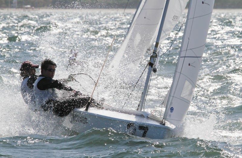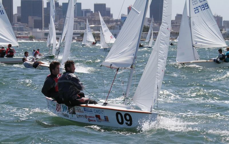 Race two was postponed for a few minutes as the R/C had to move the course west to compensate for the left shift. With the wind building to 18 knots we again saw a I course flag. The first start was recalled and the Z flag raised. The start was off just a little before 2pm. The first lap finished with Ernesto Rodriquez and Lior Lavie of USA leading at the leeward mark and closely followed by the rest of the fleet. The current was changing and tide lines could be seen developing on the course. By the finish it was Rodriguez/Lavie taking line honors and Luis Soubie / Diego Lipszyc of ARG finishing second. The fleet was quite spread out and with a 3:30 time limit, it was going to be close for getting in a 3rd race for the day.