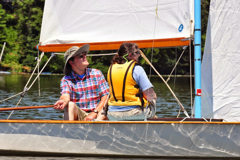 In addition to the racing results, special trophies were awarded for the Most Seasoned Team (highest age of skipper + crew + boat), which was won by Ernie and Sue Hardy. Hull #13, the second oldest boat on site sailed by Sarah Cushing and Bill Ridge, was awarded the Sailor’s Choice award. And Steve Lee/Todd Calvin won the farthest travelled award for bringing “Woody” all the way from Rochester, NY. Todd was also the most obviously dressed for his boat’s decade, 1970, in a tie-dye T-shirt.