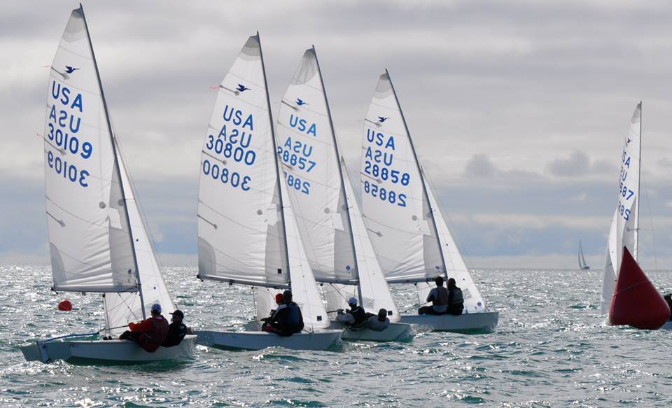 [caption id="attachment_8825" align="alignnone" width=""]Elizabeth Szabo checks the size of the D6 trophy.[/caption]San Diego, February 7-9, 2014. Results and report by Carol Cronin Doug Hart and Ryan Hopps won the only official qualifying slot out of the Snipe Western Hemisphere and Orient Qualifier, which also served as the District 6 Championship. The three day event was sailed in two venues: South Bay and Coronado Roads. The long tow to and from the race course dominated the conversations around the keg Friday night, but in between we also fit in two short races in flat water and a shifty westerly. Hart/Hopps jumped into an early lead with a 2,1, while Chuck Sinks/Briana Provancha posted a 3,2. A shorter tow on Saturday took the 18 boat fleet out to the ocean, east of the entrance to San Diego Bay. By the 1230 start a nice WNW breeze had built enough to create a few whitecaps, and a new leader quickly emerged over three races: Rick Arneson/Diana Waterbury posted a 3,1,2 to win the difficult day. With sheers and puffs filling from both sides, no lead was safe and finishes were tight. ...