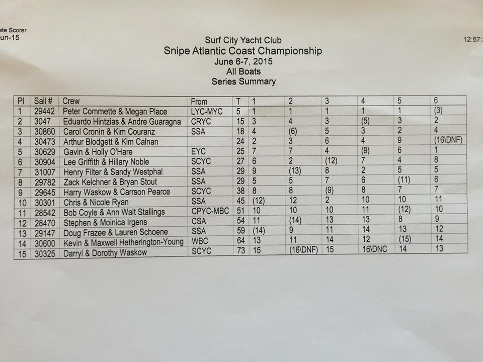 Surf City, June 6-7, 2015. Peter Commette and Megan Place win with five bullets in six races. Report by Kim Calnan. The 2015 Snipe Atlantic Coast Championship returned to Surf City Yacht Club June 6-7 and the 15 teams were greeted on Friday with a welcome BBQ at Lee and Karla Griffith’s house. Saturday morning brought rain and light winds. Racing was postponed ashore – giving the sailors the opportunity to catch up with friends (and a few even enjoyed a group nap). By noon the breeze had filled in, and it eventually built to 12-15 knots out of the northeast and the race committee was able to run four races. Peter Commette and crew Megan Place started the regatta off strong with four straight bullets. Racing was tight among the rest of the fleet with Arthur Blodgett/Kim Calnan in second and Eduardo Mintzias/Andre Guaragna in third—but the two teams were within one point of each other.