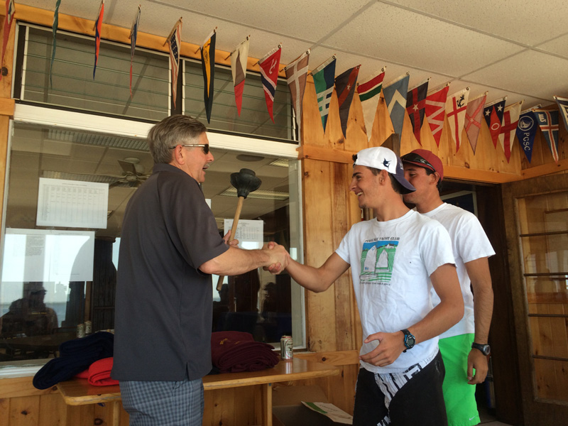 Saturday morning brought rain and light winds. Racing was postponed ashore – giving the sailors the opportunity to catch up with friends (and a few even enjoyed a group nap). By noon the breeze had filled in, and it eventually built to 12-15 knots out of the northeast and the race committee was able to run four races. Peter Commette and crew Megan Place started the regatta off strong with four straight bullets. Racing was tight among the rest of the fleet with Arthur Blodgett/Kim Calnan in second and Eduardo Mintzias/Andre Guaragna in third—but the two teams were within one point of each other.