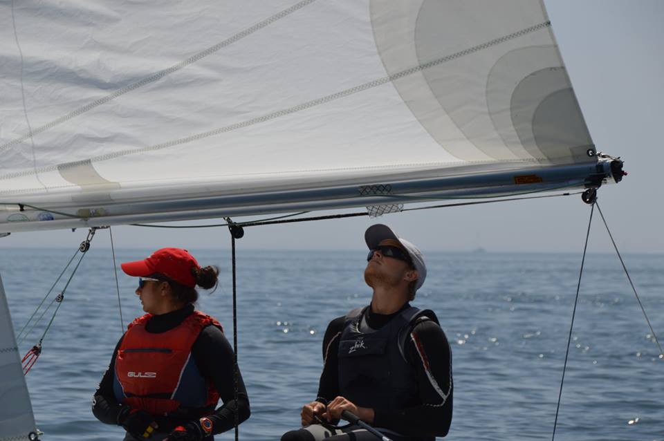 Evert McLaughlin with crew Alexandra Damley-Strnad dominated the day. Of the five races sailed, Evert and Alex won 4 and finished 3 in the other. After the first day they held a comfortable lead over Julian Inglis/Leo Arsenault in second and Jefferson and Tracy Hall in third.