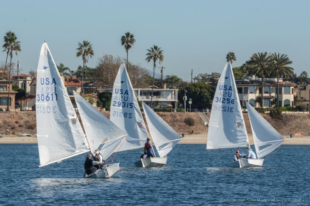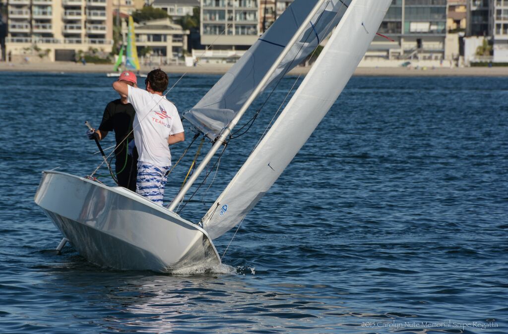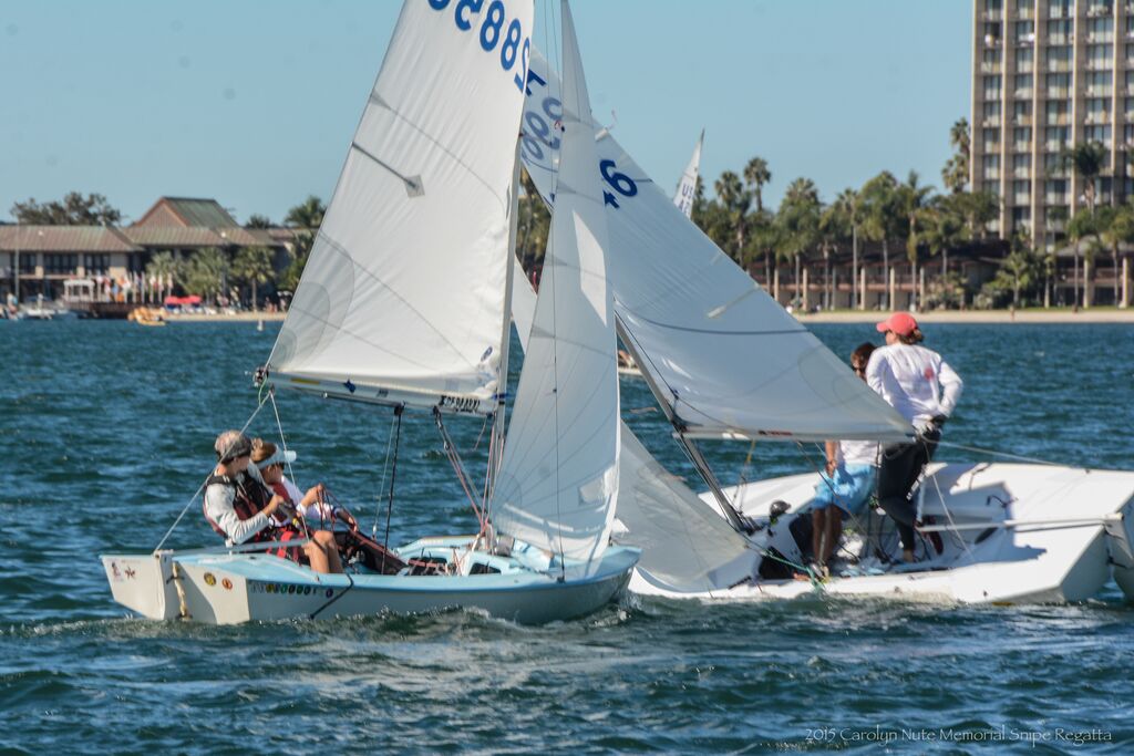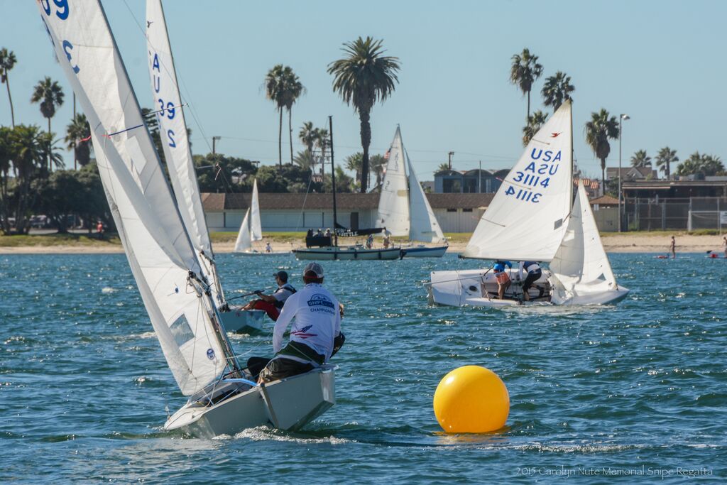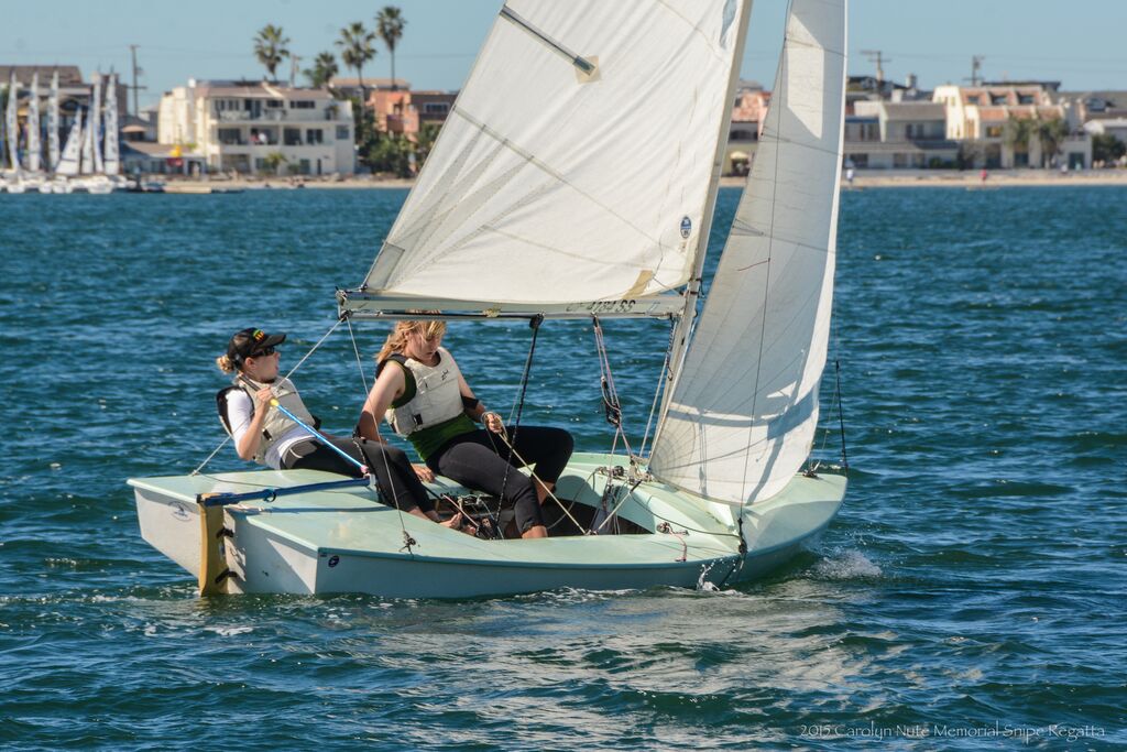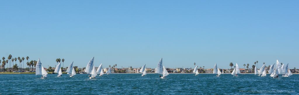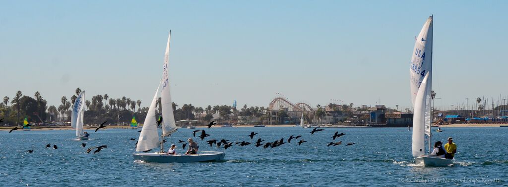 Mission Bay, October 31 - November 1, 2015. Report by Seth Siegler and photo gallery (All the pics were taken by Judy Tillson http://www.judytillsonphotography.com) San Diego has an interesting quirk where when the Santa Ana Winds rip through Socal (in some areas, at over 40 kts), it somehow results in extremely light and unstable breeze in Mission Bay. That's really saying something since for Mission Bay, 12 knots is normally considered "breezy". But even with the Santa Ana's in the forecast, San Diego's fleet 495 dove headlong into one of the best regattas of the year: The Carolyn Nute Memorial Regatta. With 23 teams registered, they rigged up on Saturday with the breeze blowing lightly from "the wrong direction". But by the time the boats slipped off the sandy beach at Mission Bay Yacht Club, the breeze had turned around and filled in to a surprising 10+ knots. Things were looking up! ...