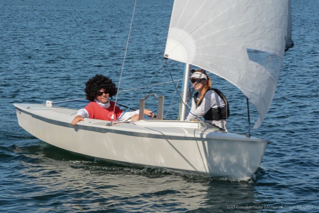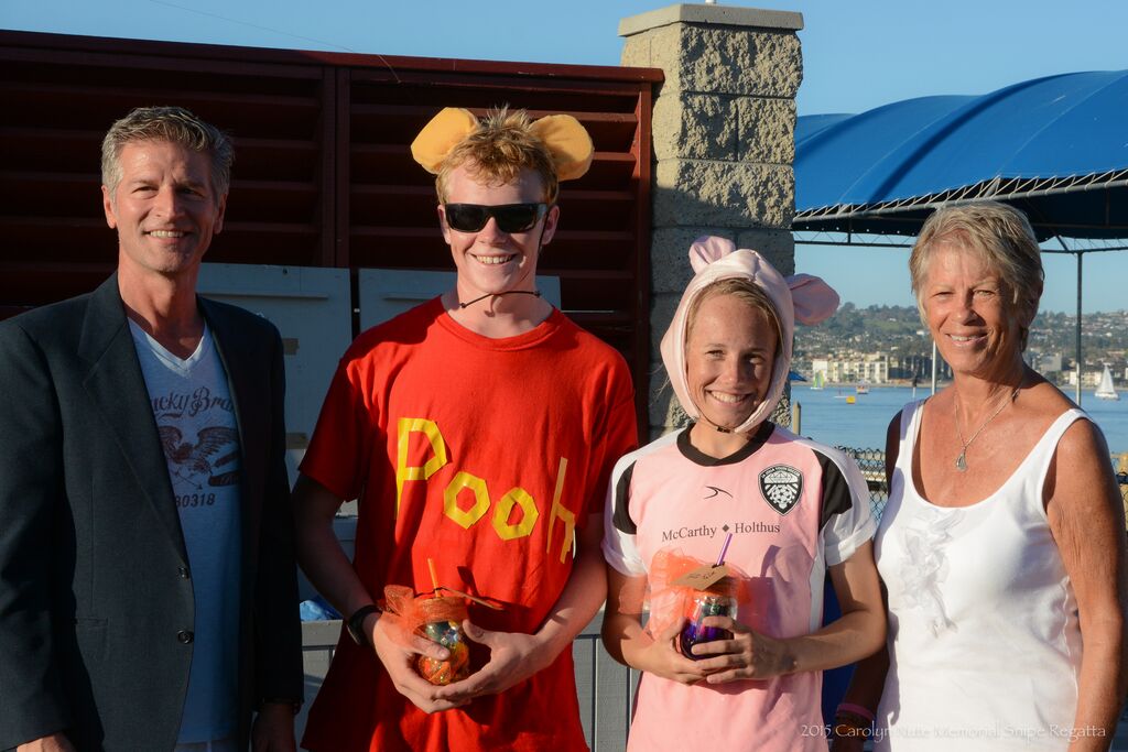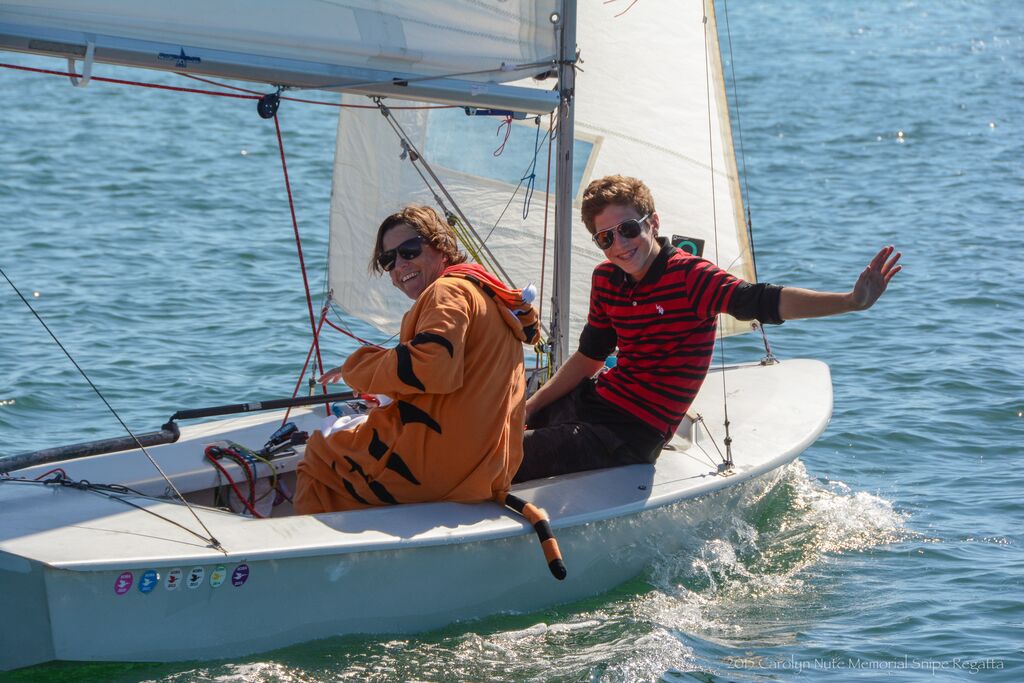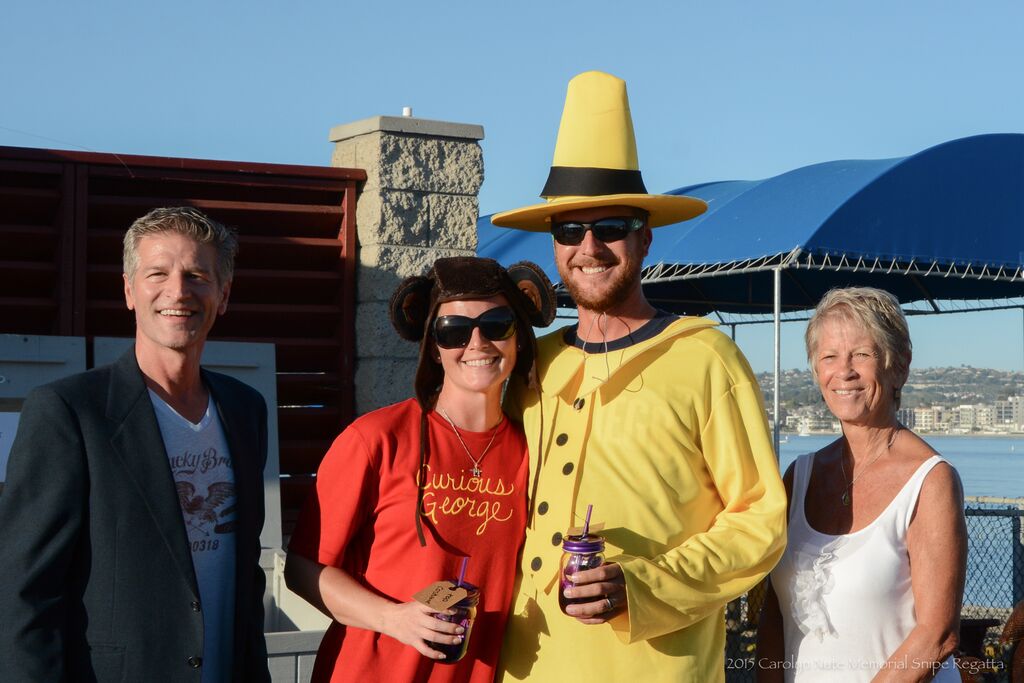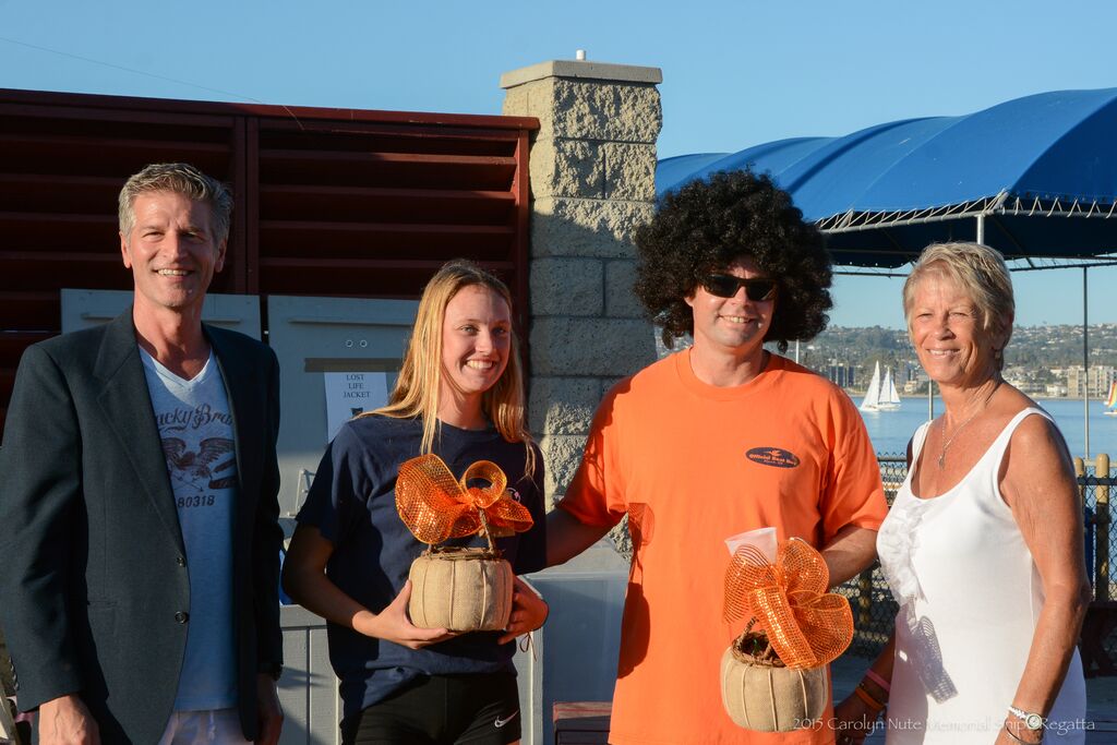 The awards ceremony was attended by Carolyn Nute’s sister, Andrea, who shared some words about her late sister and regatta namesake. She handed out awards to the top women’s team (and fleet newcomers) Marianna and Cassandra Shand, top father/daughter team of John and Avery Fretwell and best costumes to Chris and Lauren Wright (Curious George and the man in the yellow hat). The top juniors award went to Jesse McKnight and Daisy Holthus who finished sixth overall! They were among a strong jr sailor contingent including four all-junior teams and eight other junior crews with senior skippers.