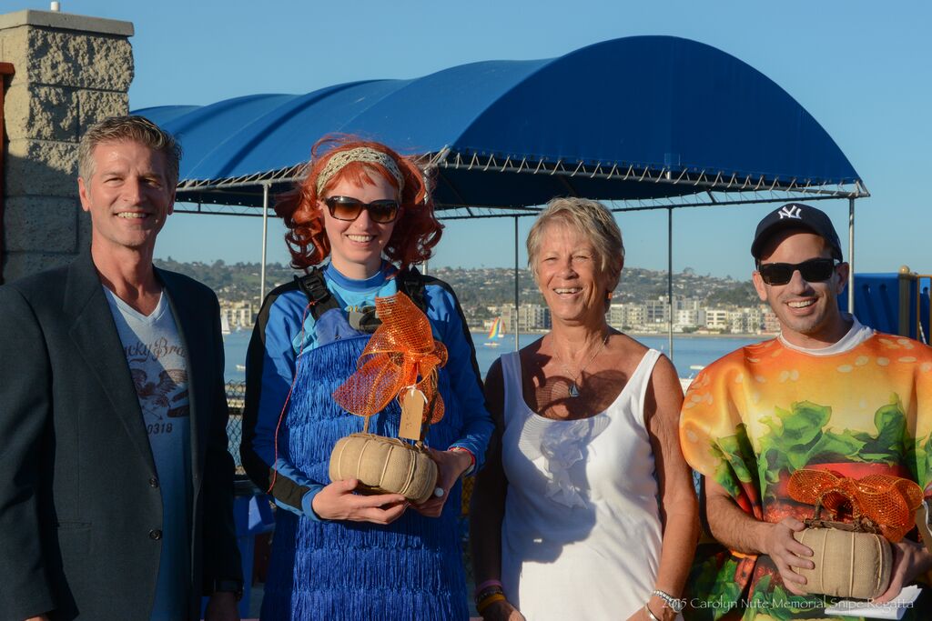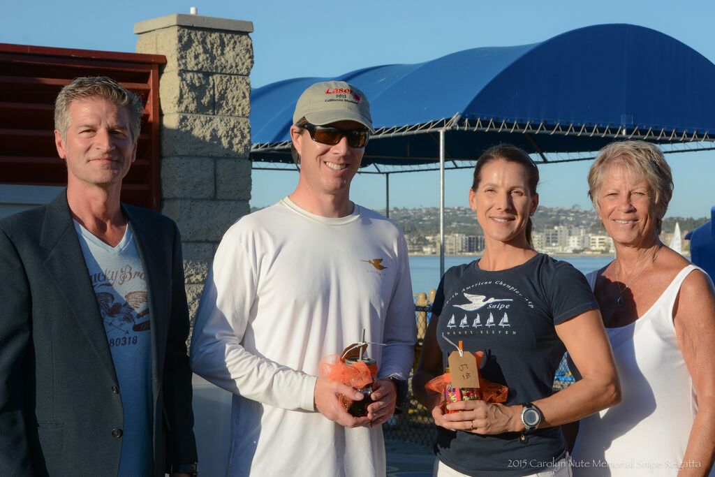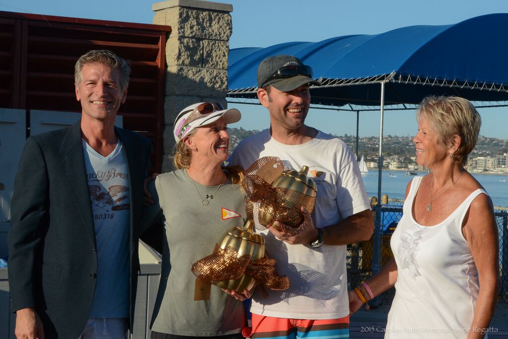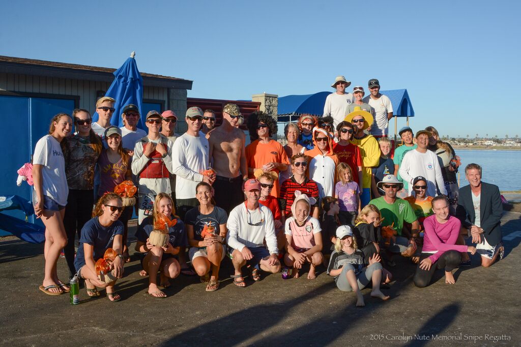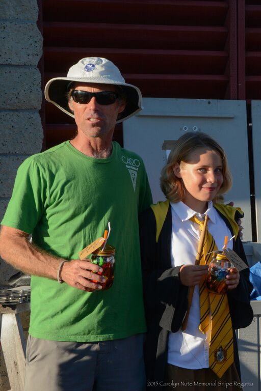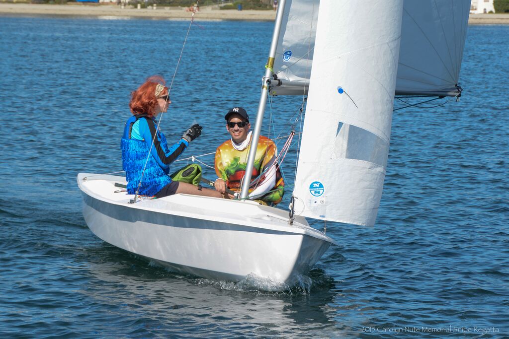 The awards ceremony was attended by Carolyn Nute’s sister, Andrea, who shared some words about her late sister and regatta namesake. She handed out awards to the top women’s team (and fleet newcomers) Marianna and Cassandra Shand, top father/daughter team of John and Avery Fretwell and best costumes to Chris and Lauren Wright (Curious George and the man in the yellow hat). The top juniors award went to Jesse McKnight and Daisy Holthus who finished sixth overall! They were among a strong jr sailor contingent including four all-junior teams and eight other junior crews with senior skippers.